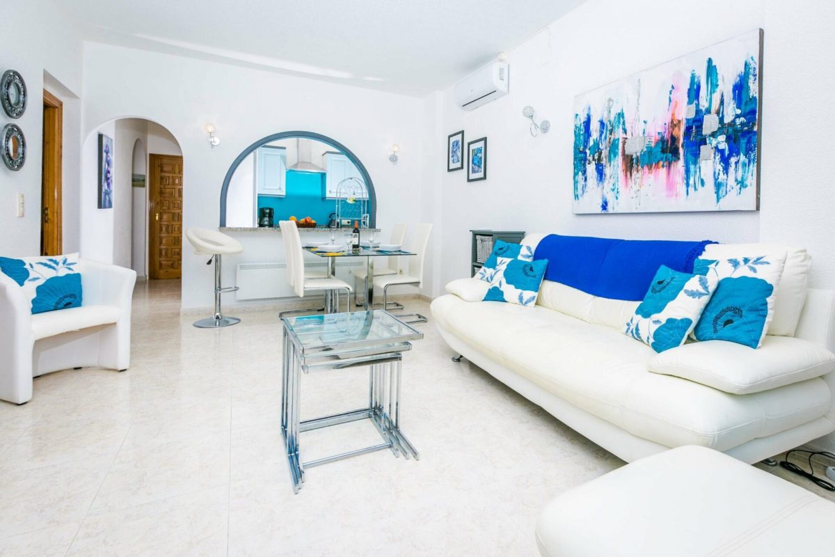 The apartment has two bedrooms, one with a double bed that opens out onto the terrace and another with two single beds. The beautiful, airy lounge/dining room opens out onto the terrace creating a great light dining space. There are patio doors that open fully onto the terrace with dining for 4 people and allday sun. The property comes equipped with dishwasher and washing machine as well as satellite tv.