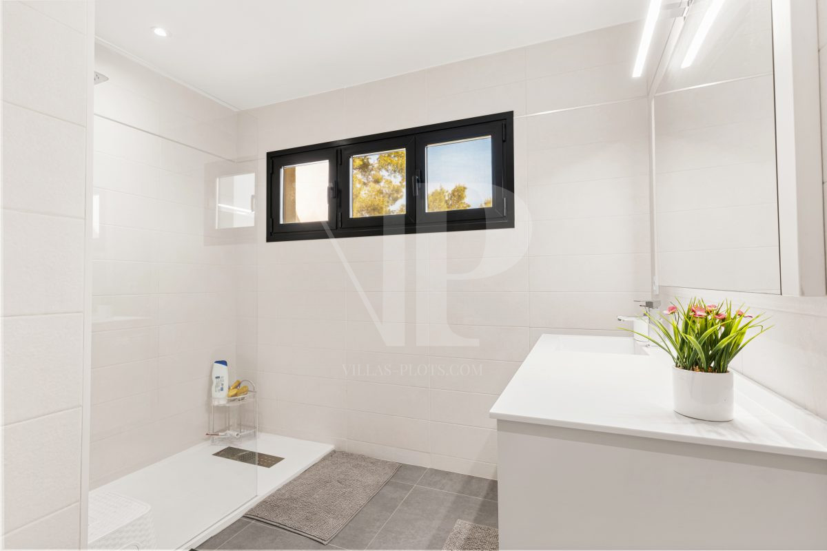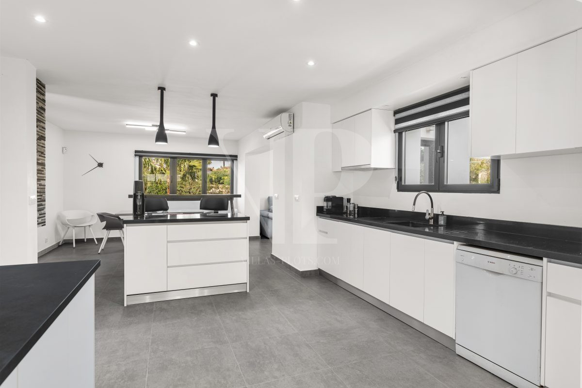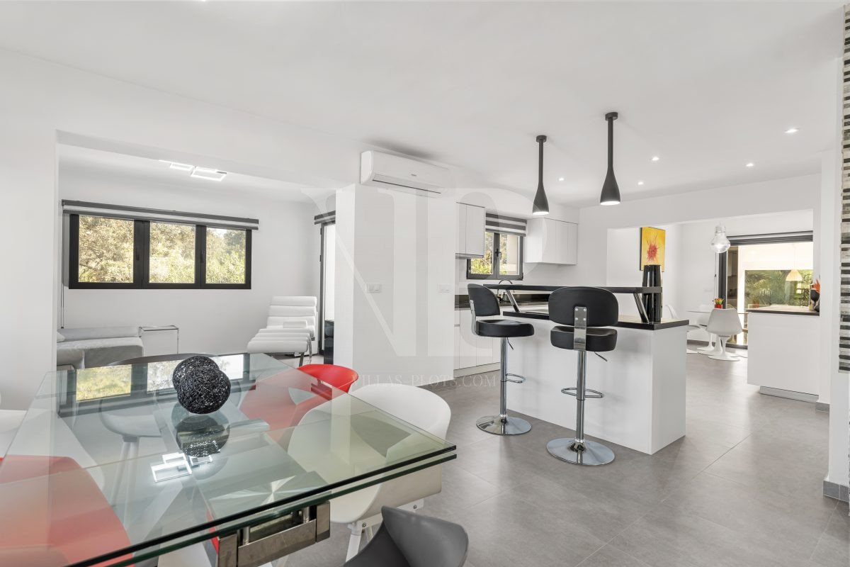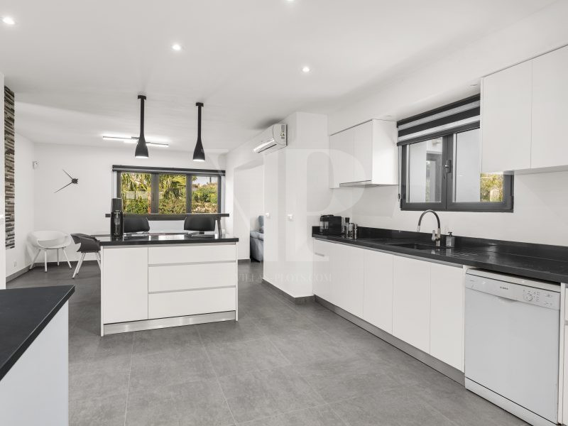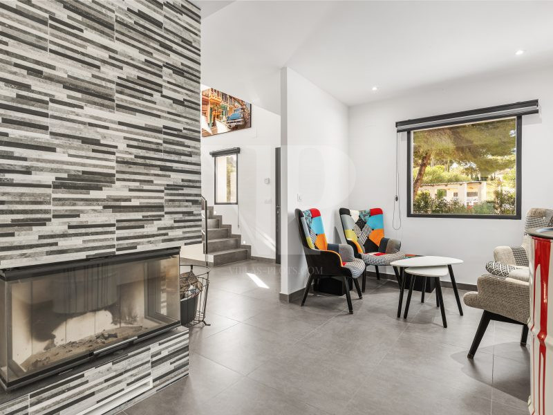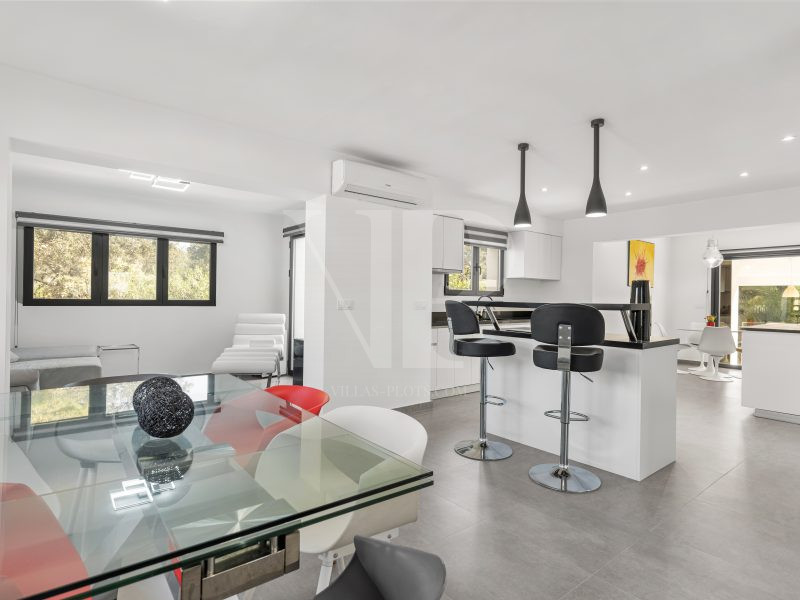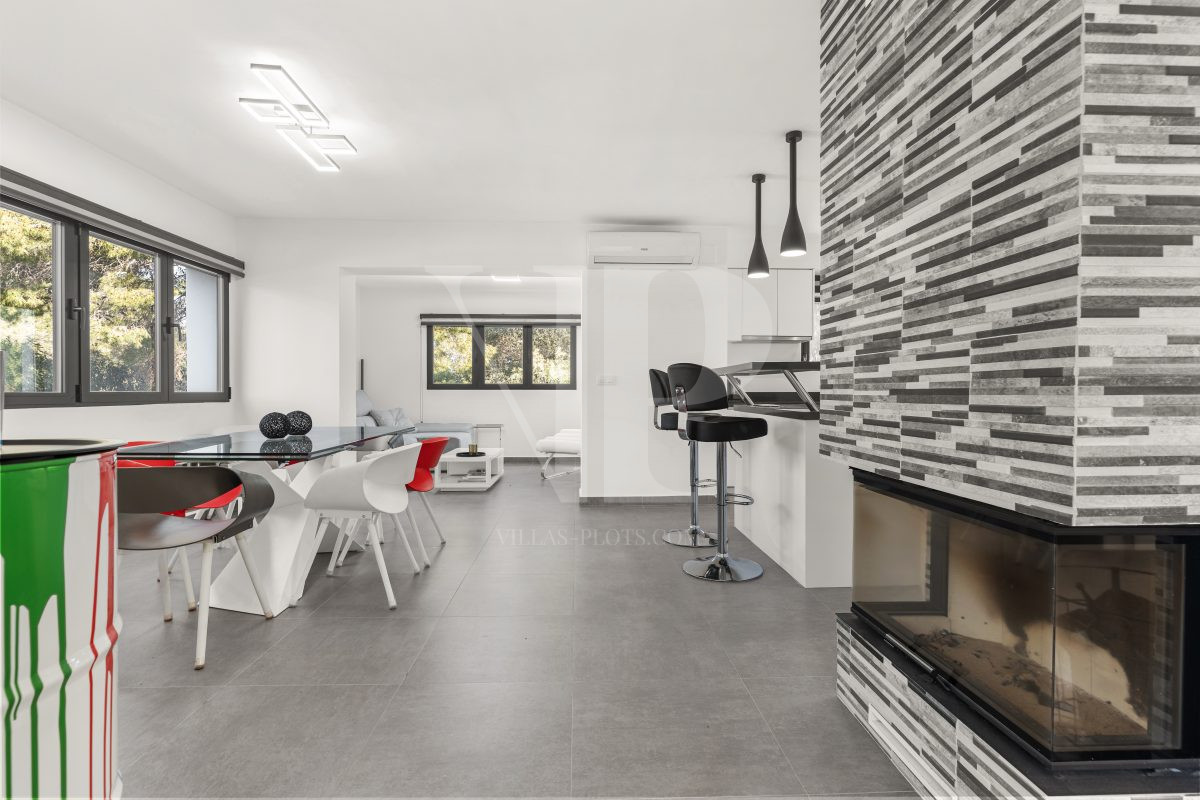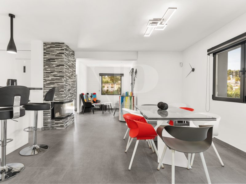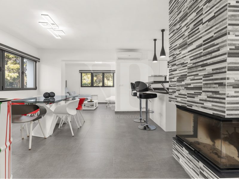 The villa has been completely renovated in a contemporary style and comprises a large entrance hall leading to a living room with open fire, a spacious dining room and a huge open-plan kitchen.