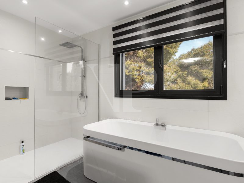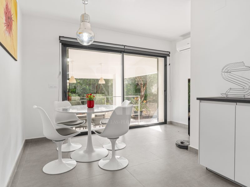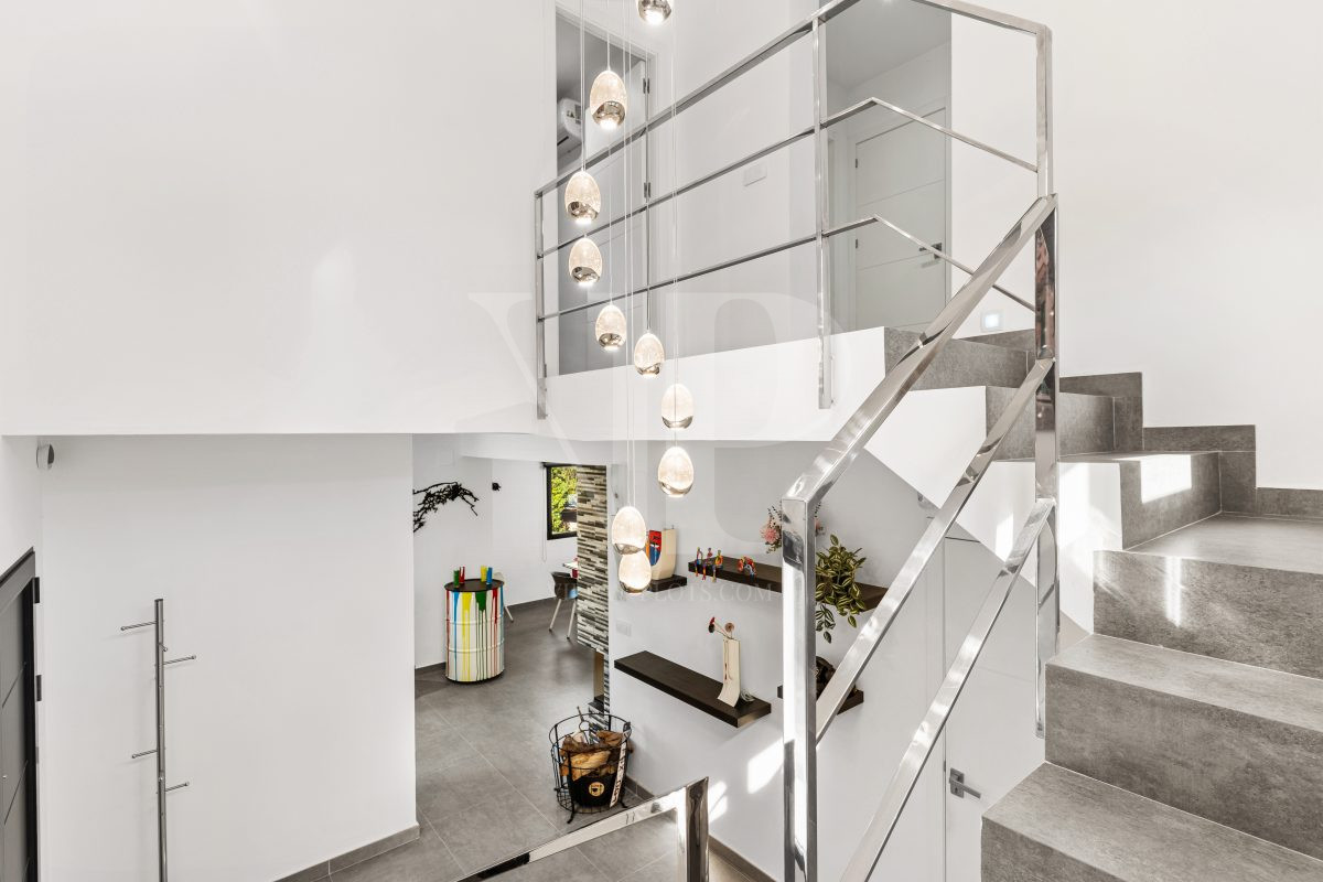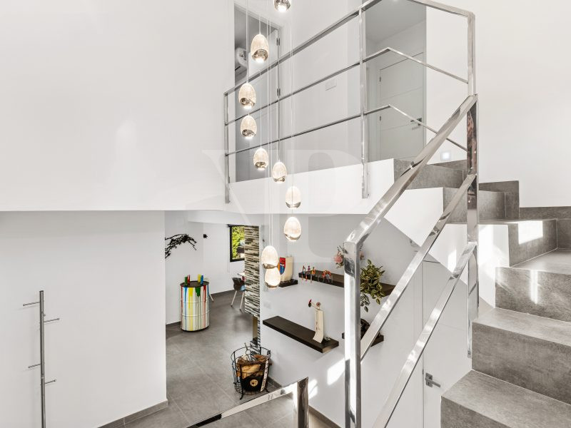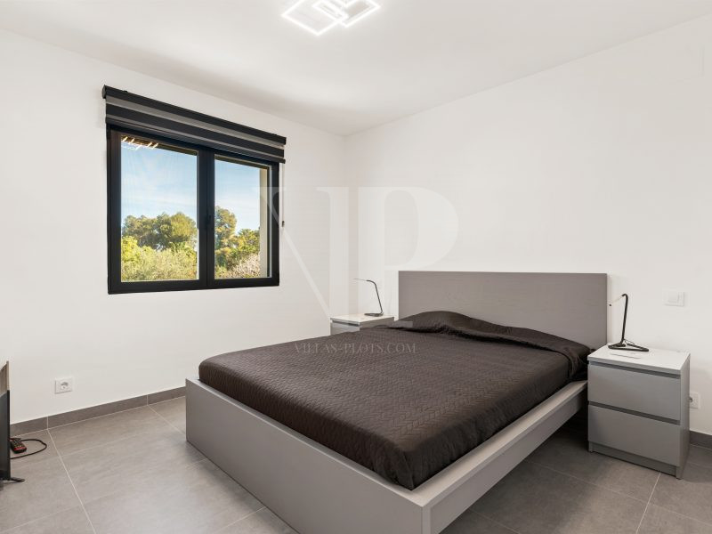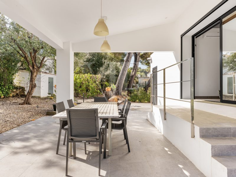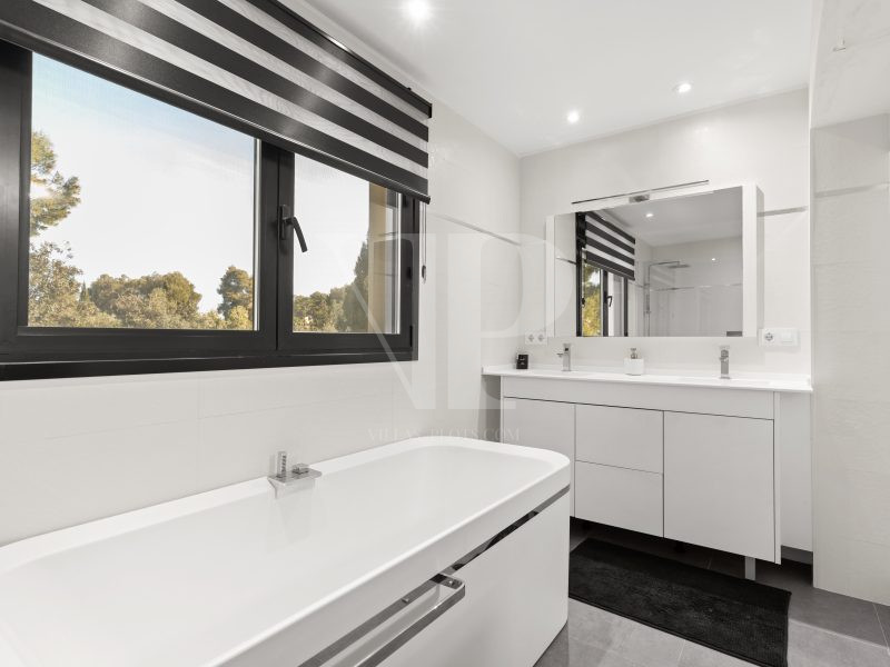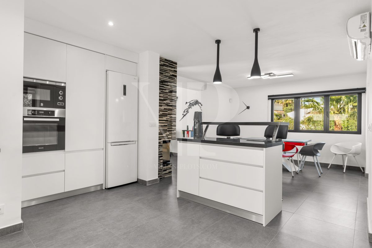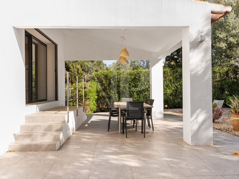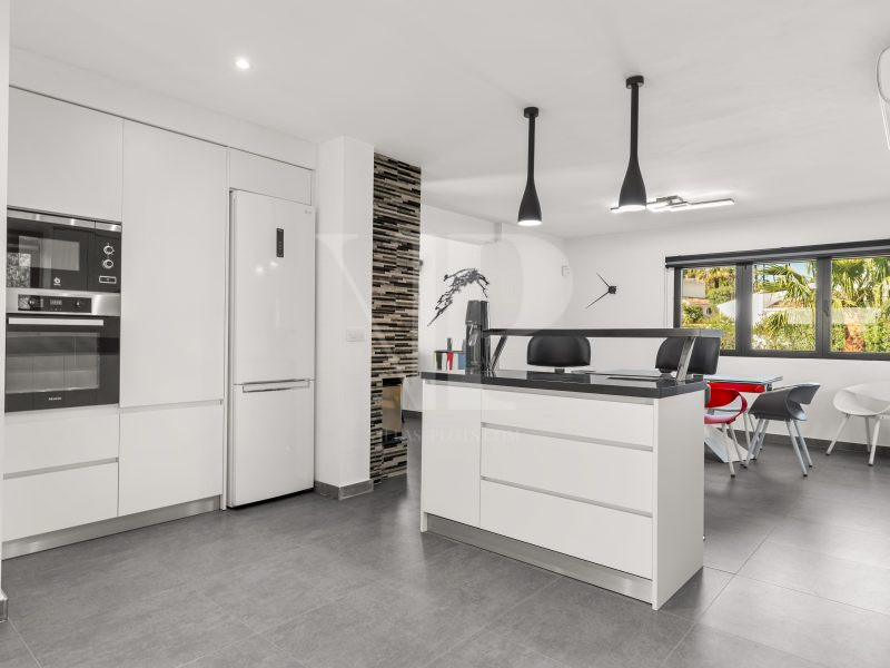 The villa has been completely renovated in a contemporary style and comprises a large entrance hall leading to a living room with open fire, a spacious dining room and a huge open-plan kitchen.