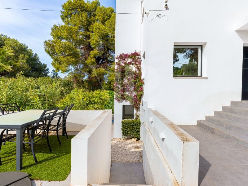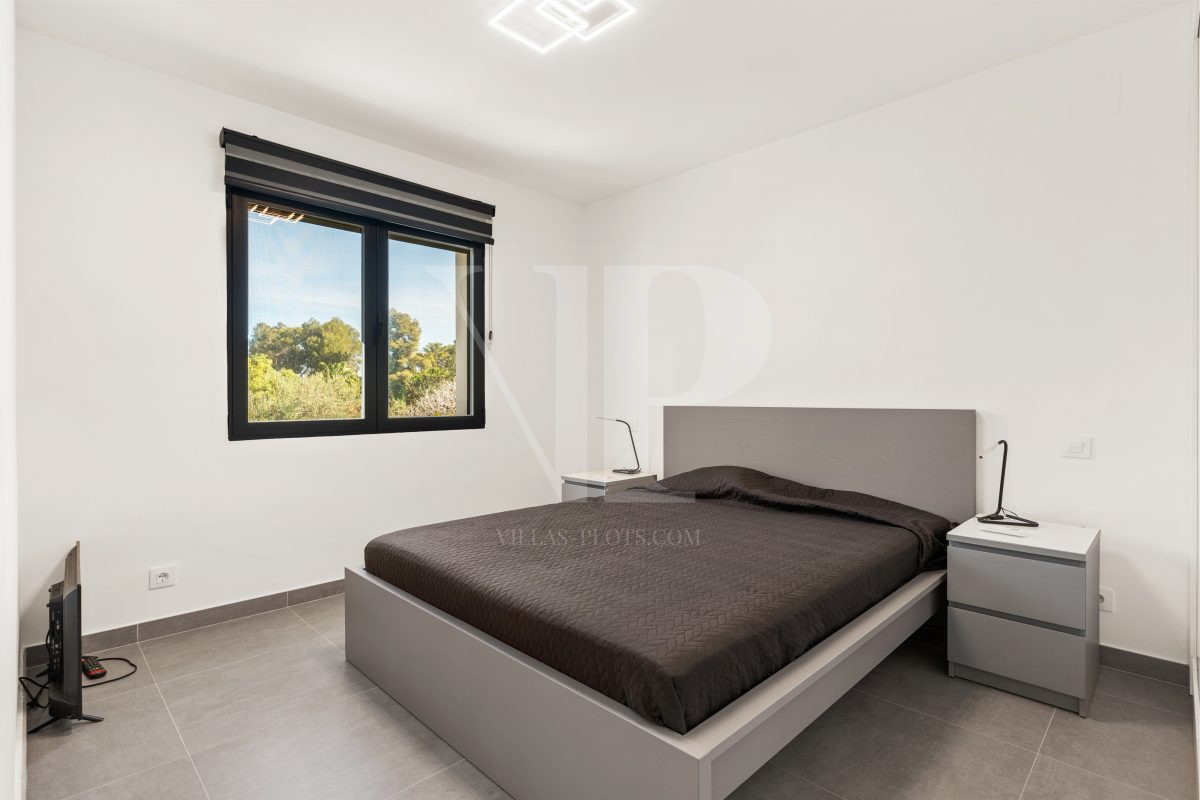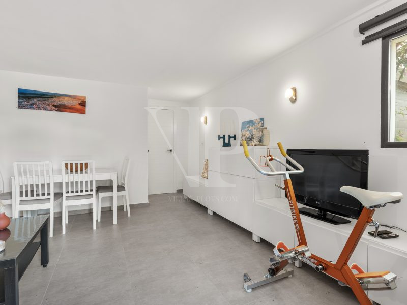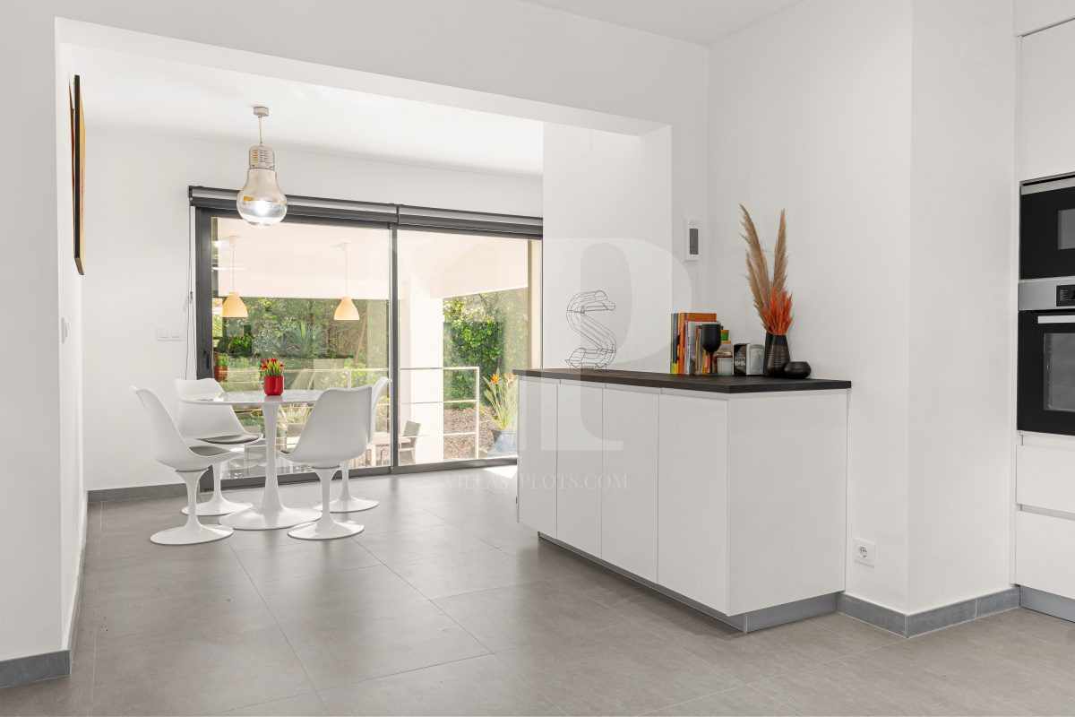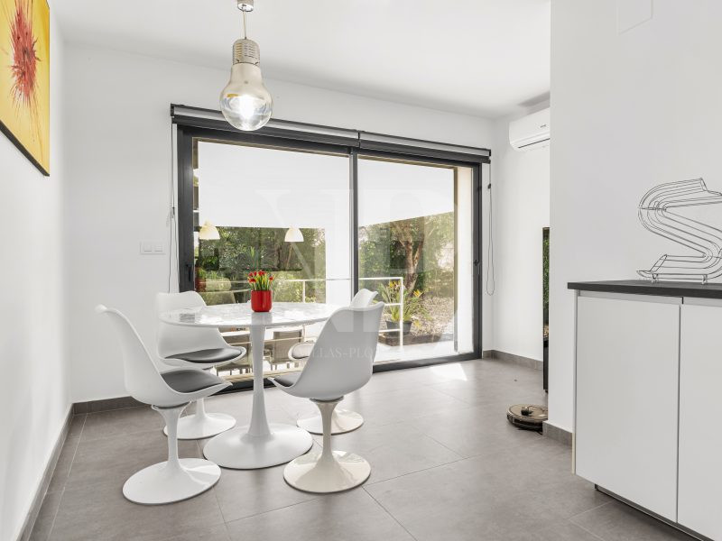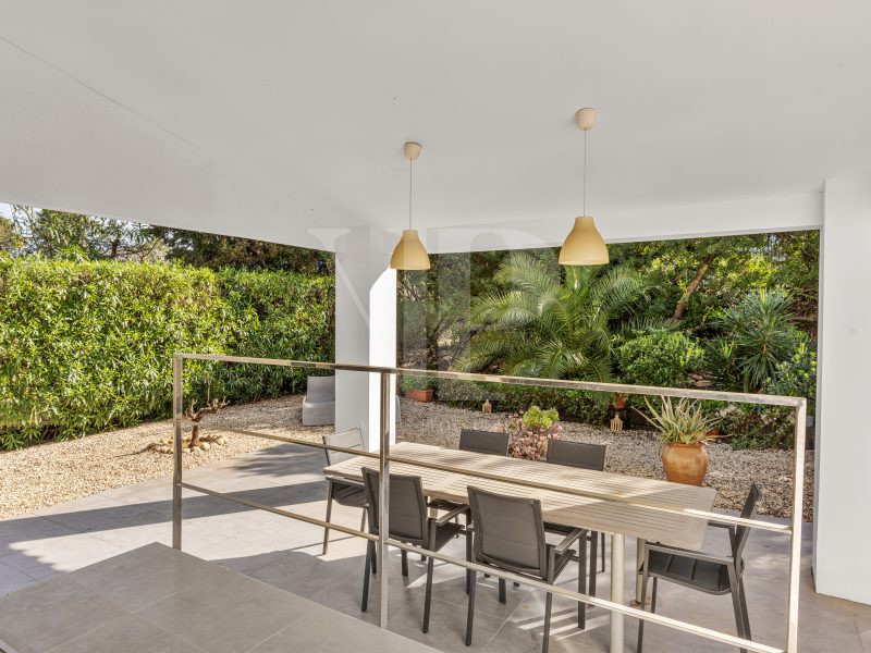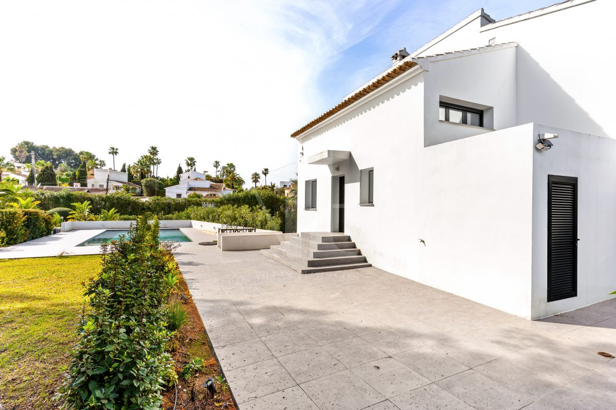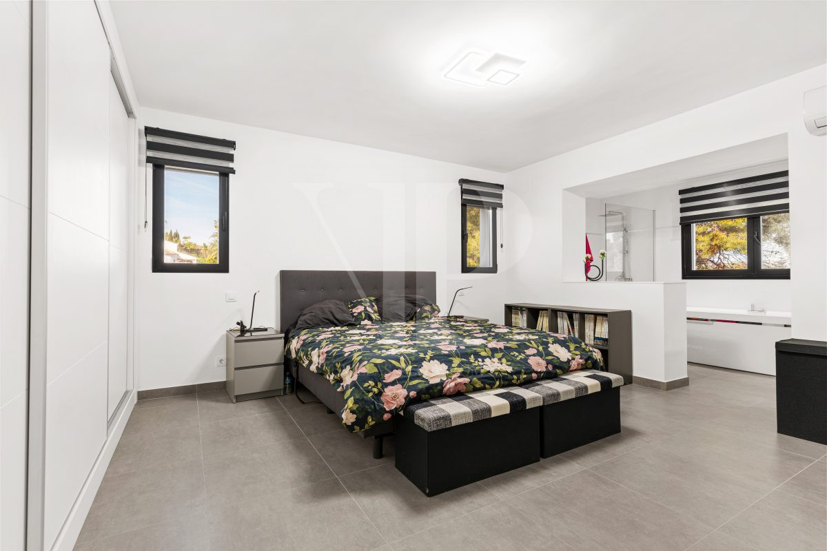 The villa has been completely renovated in a contemporary style and comprises a large entrance hall leading to a living room with open fire, a spacious dining room and a huge open-plan kitchen.