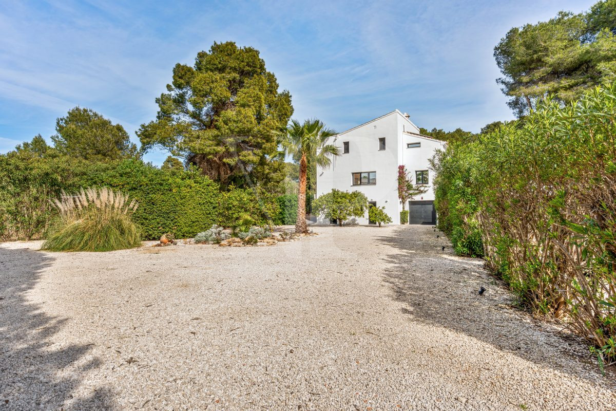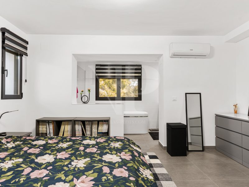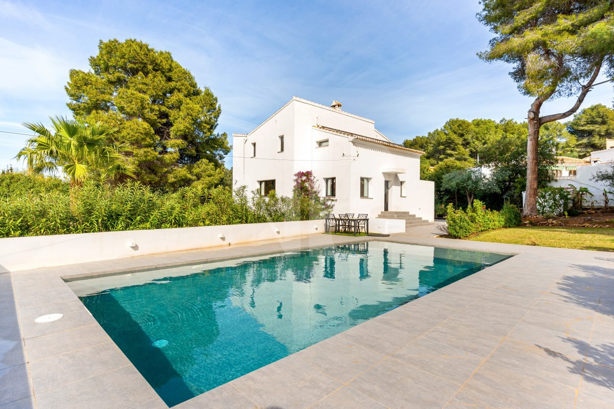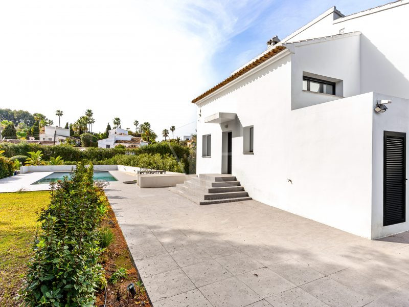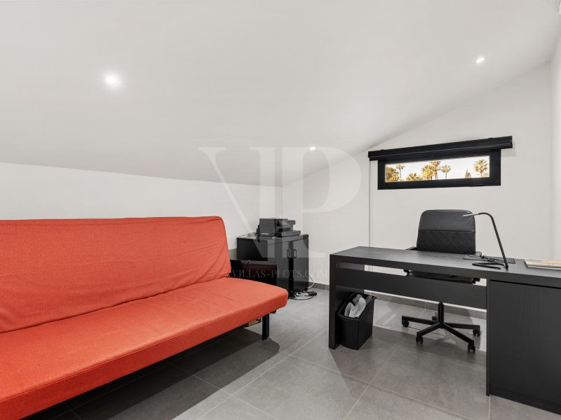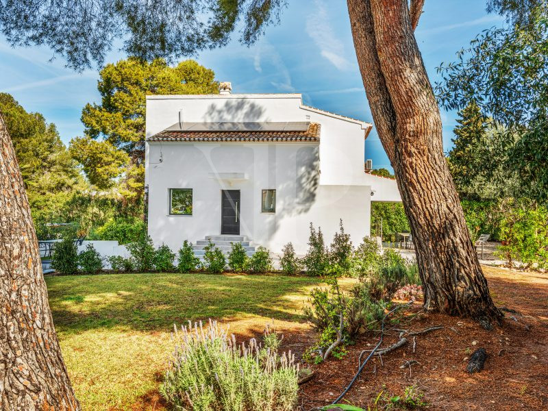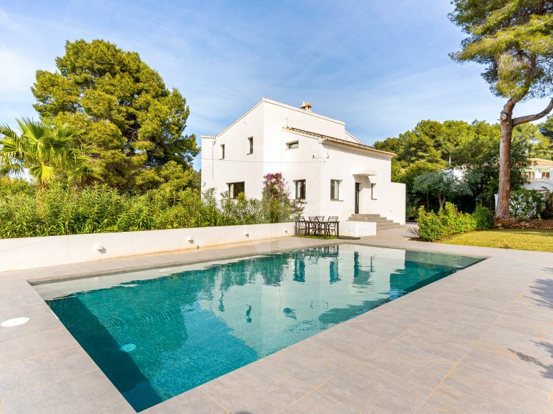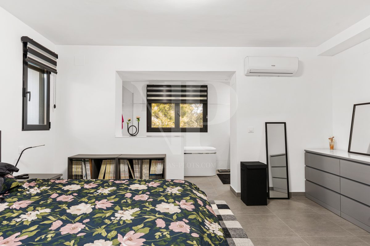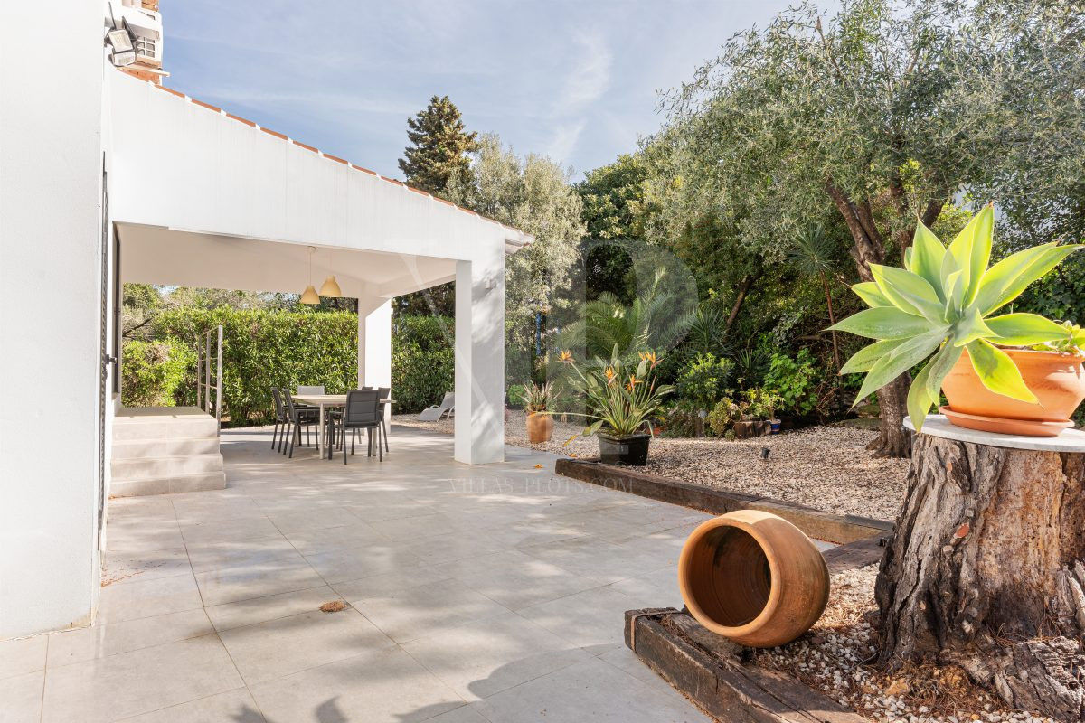 The villa has been completely renovated in a contemporary style and comprises a large entrance hall leading to a living room with open fire, a spacious dining room and a huge open-plan kitchen.