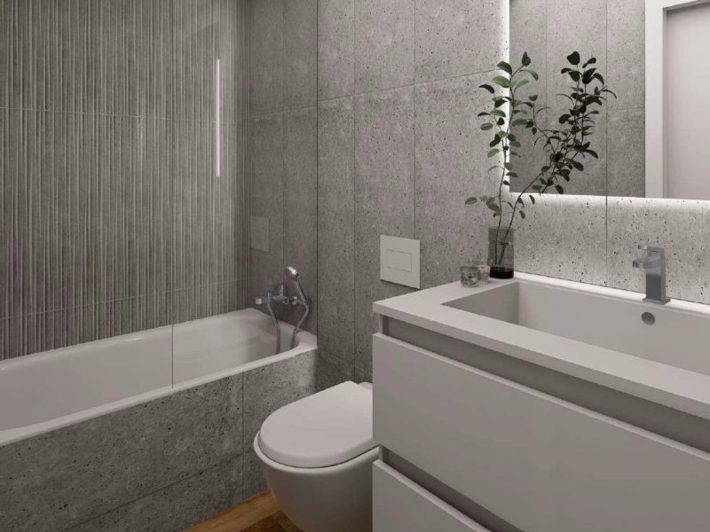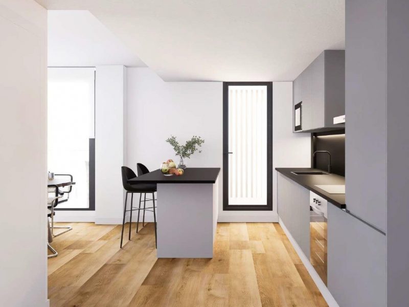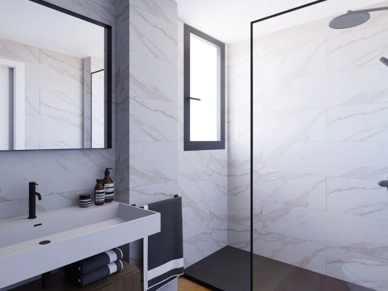 The flat features built-in wardrobes, electric shutters in the sleeping areas and double-glazed PVC sash windows. To ensure a pleasant temperature all year round, both underfloor heating and air conditioning hot/cold are installed based on an energy-efficient heat pump. The property is further equipped with a video intercom for added security and convenience. The residential complex consists of three modern buildings with different housing types, ranging from flats with garden on the ground floor, flats with terrace on the first floor, to the exclusive duplex penthouses on the second floor. To finish your home, you can choose from three styles: Contemporary, Timeless or Nature. The renders used reflect the contemporary ‘Contemporary’ style.