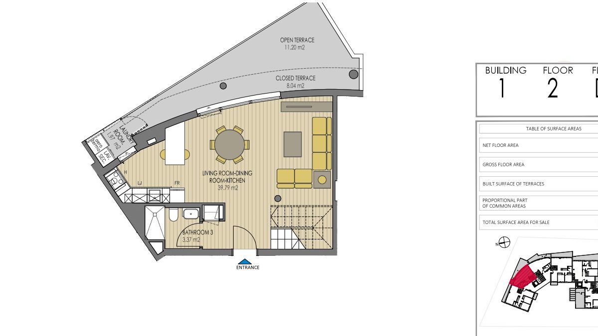The flat features built-in wardrobes, electric shutters in the sleeping areas and double-glazed PVC sash windows. To ensure a pleasant temperature all year round, both underfloor heating and air conditioning hot/cold are installed based on an energy-efficient heat pump. The property is further equipped with a video intercom for added security and convenience. The residential complex consists of three modern buildings with different housing types, ranging from flats with garden on the ground floor, flats with terrace on the first floor, to the exclusive duplex penthouses on the second floor. To finish your home, you can choose from three styles: Contemporary, Timeless or Nature. The renders used reflect the contemporary ‘Contemporary’ style.