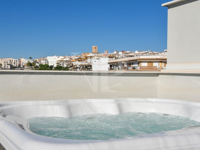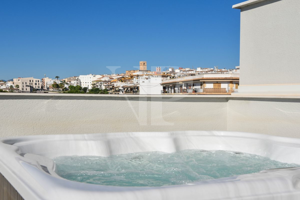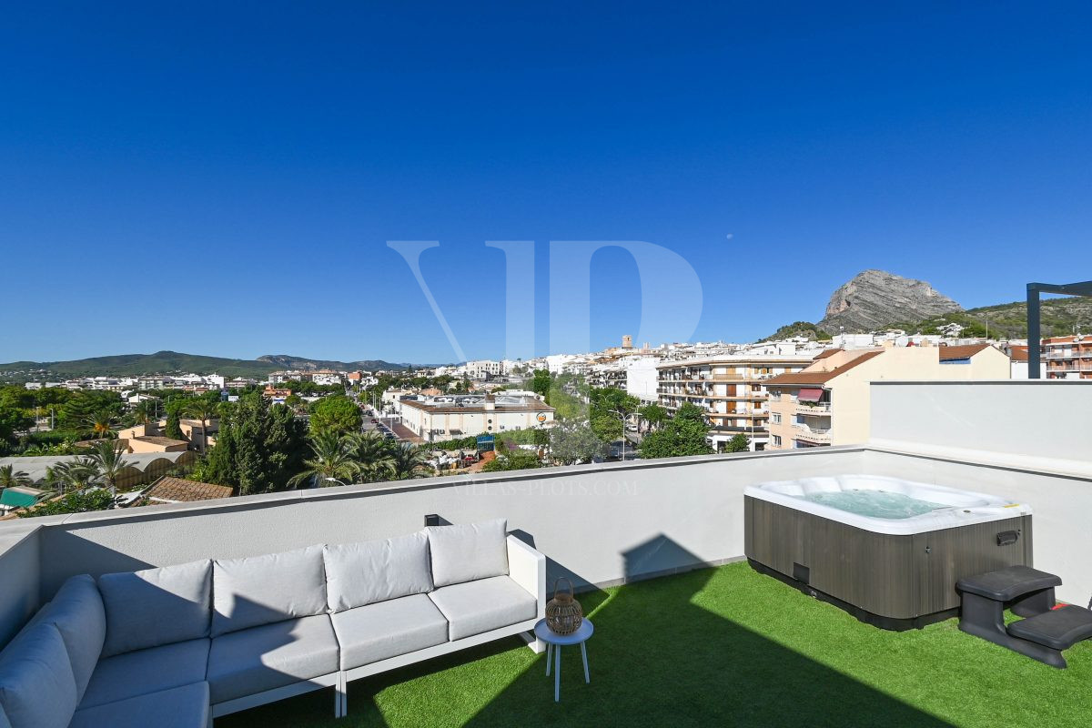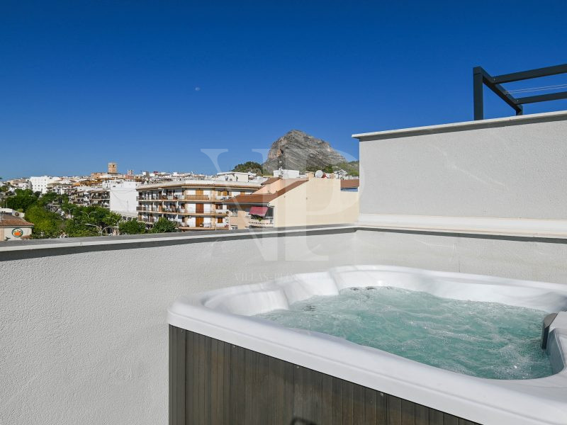 From the spacious roof terrace of no less than 82 m² with jacuzzi you can enjoy a panoramic view of the church of the old village of Javea, the Montgó, the historic mills and even a glimpse of the sea.