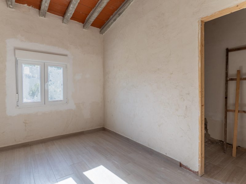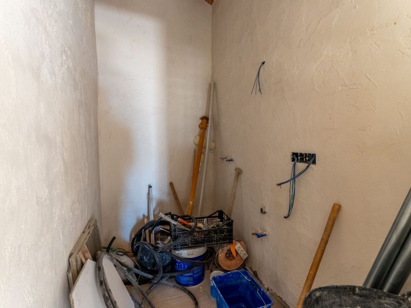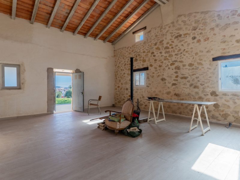 The house has been extended and partially renovated, preserving the original character of the building. It features a main living area where the dry stone walls have been retained, adding authenticity and charm. The roof has been completely renovated and raised to a height of 9 meters, allowing for the possibility of creating an attic or additional living space.