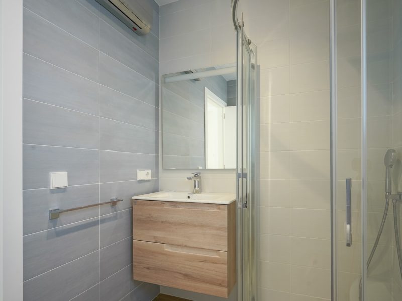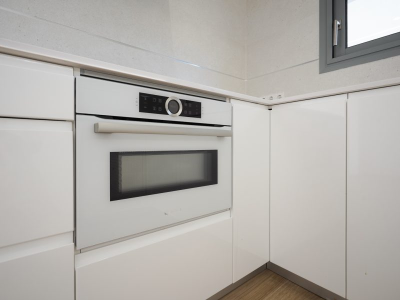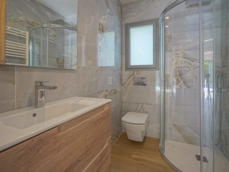 The entire living area is located at the pool level and includes a spacious living and dining room with an open-plan kitchen, equipped with a multifunctional Bosch oven, dishwasher, refrigerator, freezer and induction hob. There is also a master bedroom with an en-suite bathroom and two additional bedrooms that share a second bathroom.