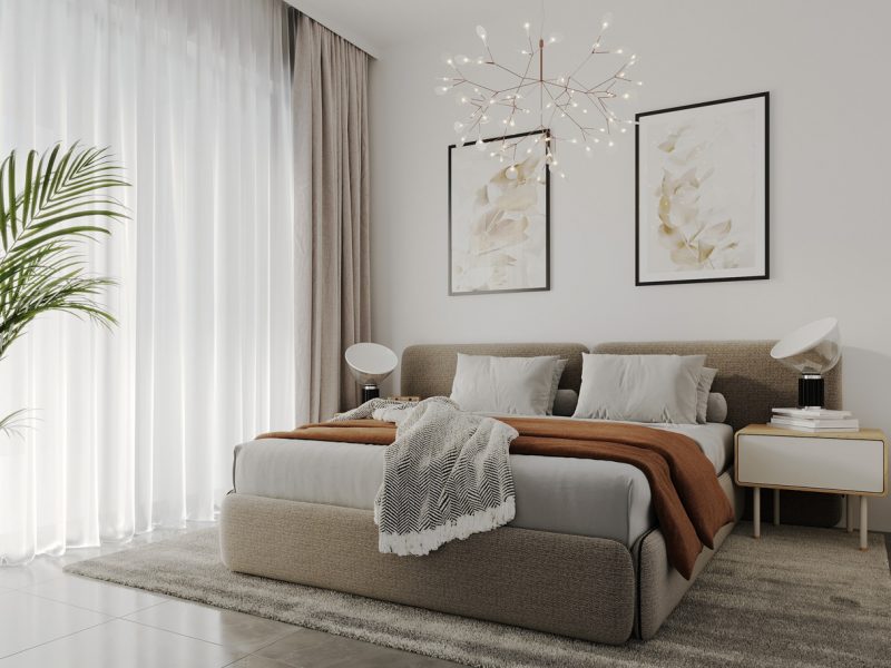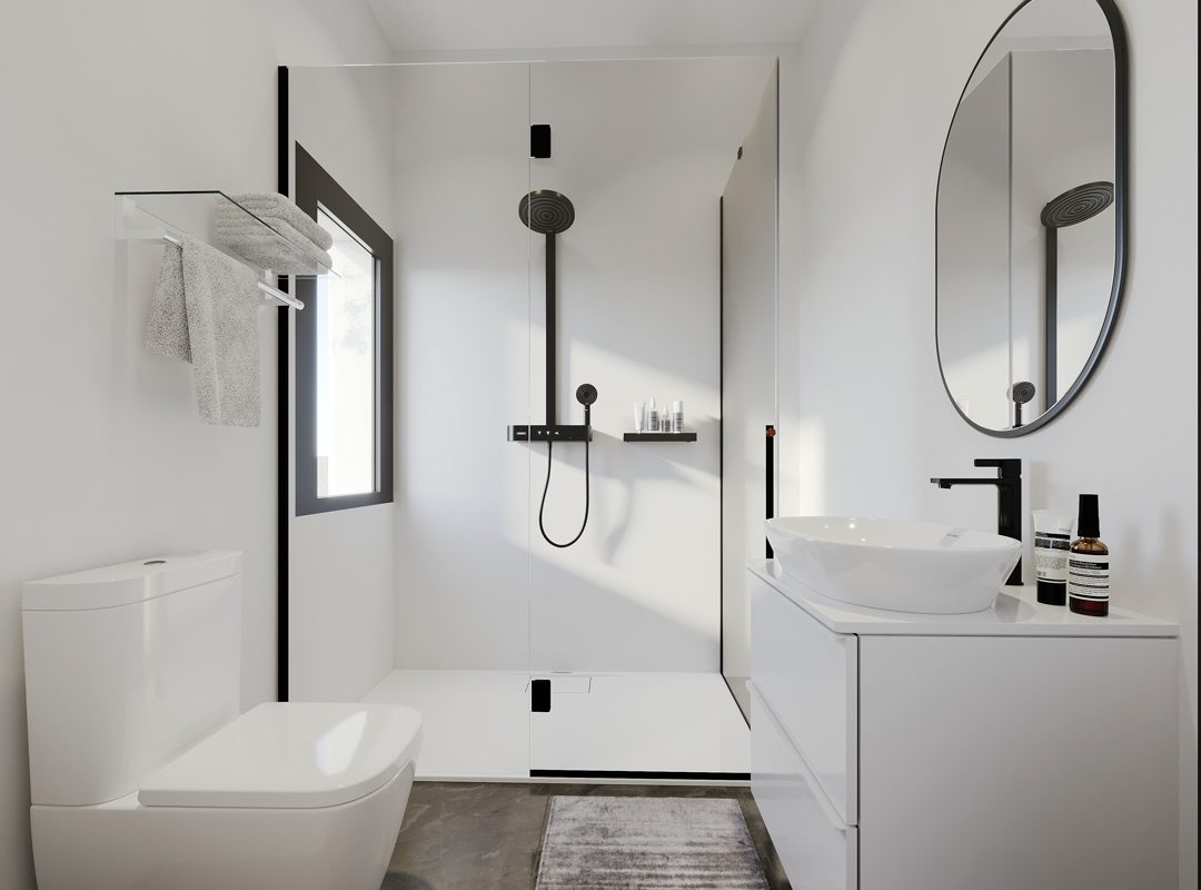 The villa is spread over two floors. The ground floor consists of a spacious living-dining room with an adjoining open kitchen fully equipped with Bosch appliances and a cooking island. Thanks to the extra-high windows and double ceiling, the living room is an oasis of light and space. Next to the living room is a double bedroom with an en-suite bathroom. For extra comfort, there is also a guest toilet. The upper floor consists of two spacious bedrooms, both with en-suite bathrooms and private terraces. The master bedroom also has a spacious dressing room.