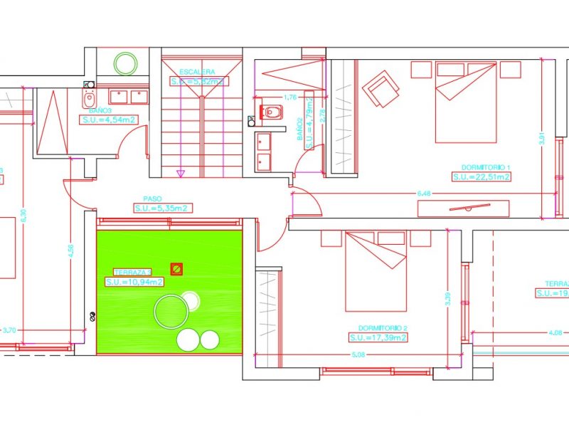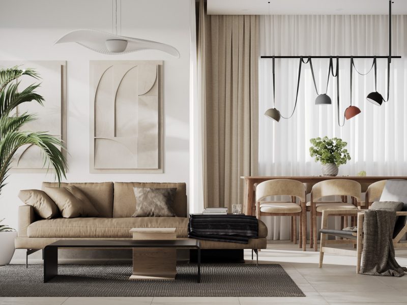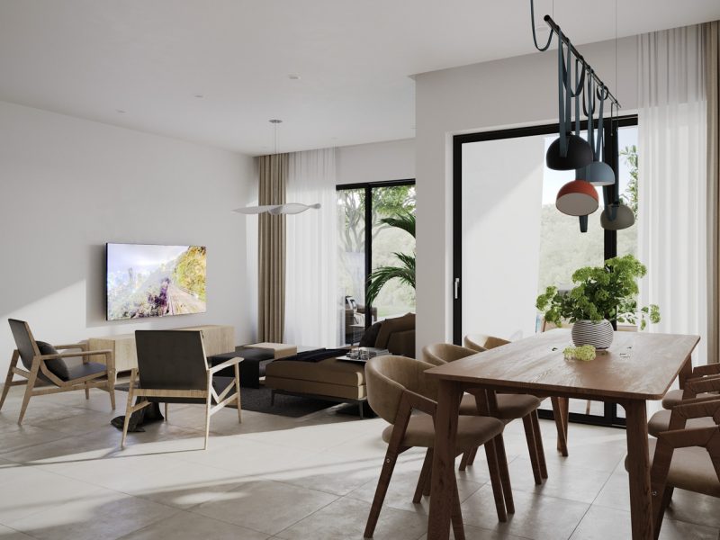 Each villa is spread over two floors. The ground floor consists of a spacious living-dining room with an adjoining open kitchen with a cooking island. For extra comfort, there is also a bathroom on this floor. On the upper floor is the master bedroom with an en-suite bathroom and a spacious terrace with a south-east orientation. There are also two spacious bedrooms that share a bathroom and a terrace. In addition, each villa has a garage on the ground floor.