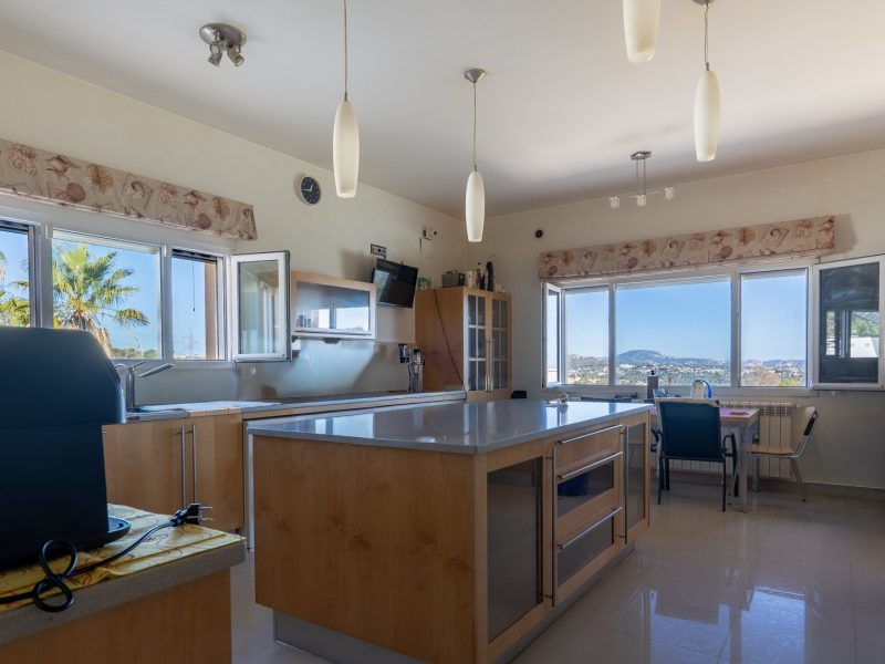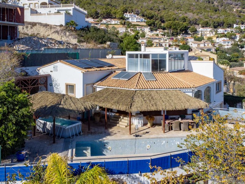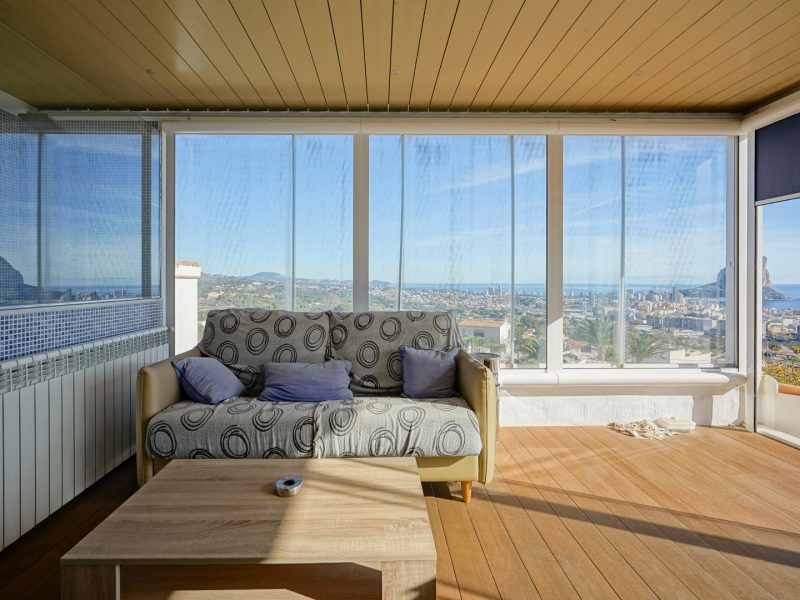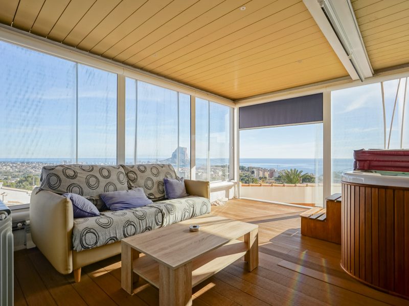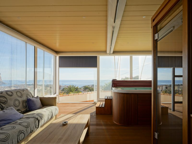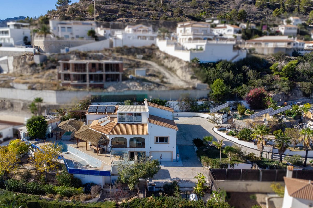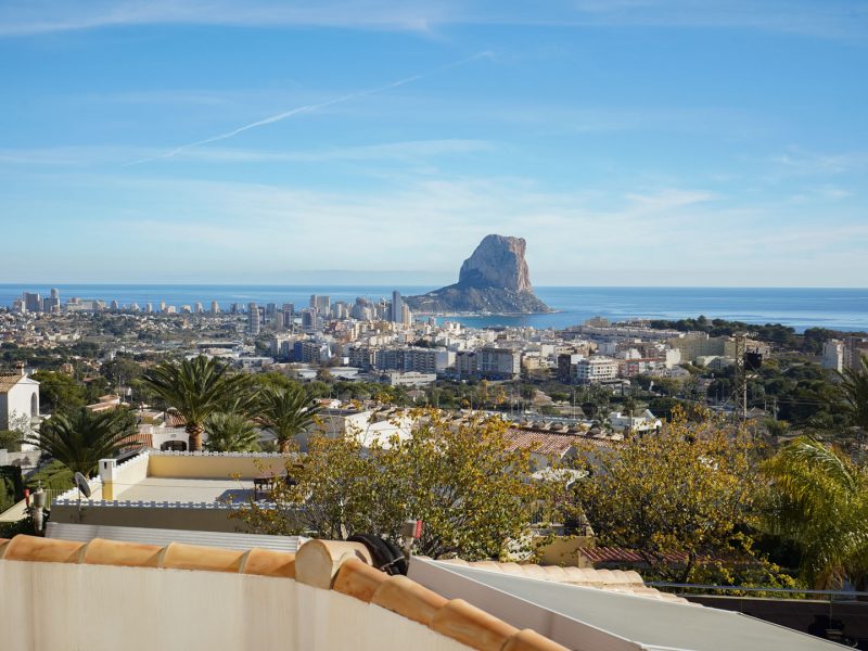This remarkable villa, built in 2006 on a large 2,210 m2 plot, is spread over three floors and offers exceptional panoramic views stretching from Cap d’Or in Moraira to beyond the Peñón de Ifach and the skyline of Calpe.