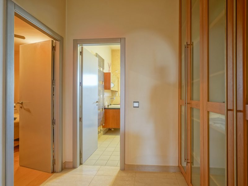The main floor stands out for its spaciousness and comfort. Upon entering, you are greeted by a bright hall that leads to a large built-in bar, ideal for entertaining guests and a generous living room with direct access to the covered terrace. The spacious, fully equipped kitchen features custom made furniture with interior lighting and enjoys beautiful sea views. On this same level are two large bedrooms, each with a walk-in wardrobe and en-suite bathroom, providing a high level of privacy and comfort.