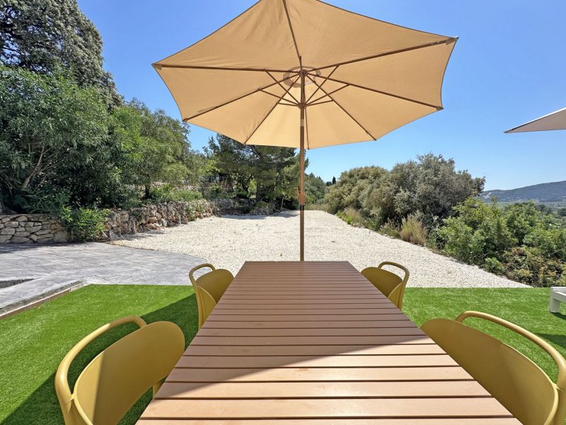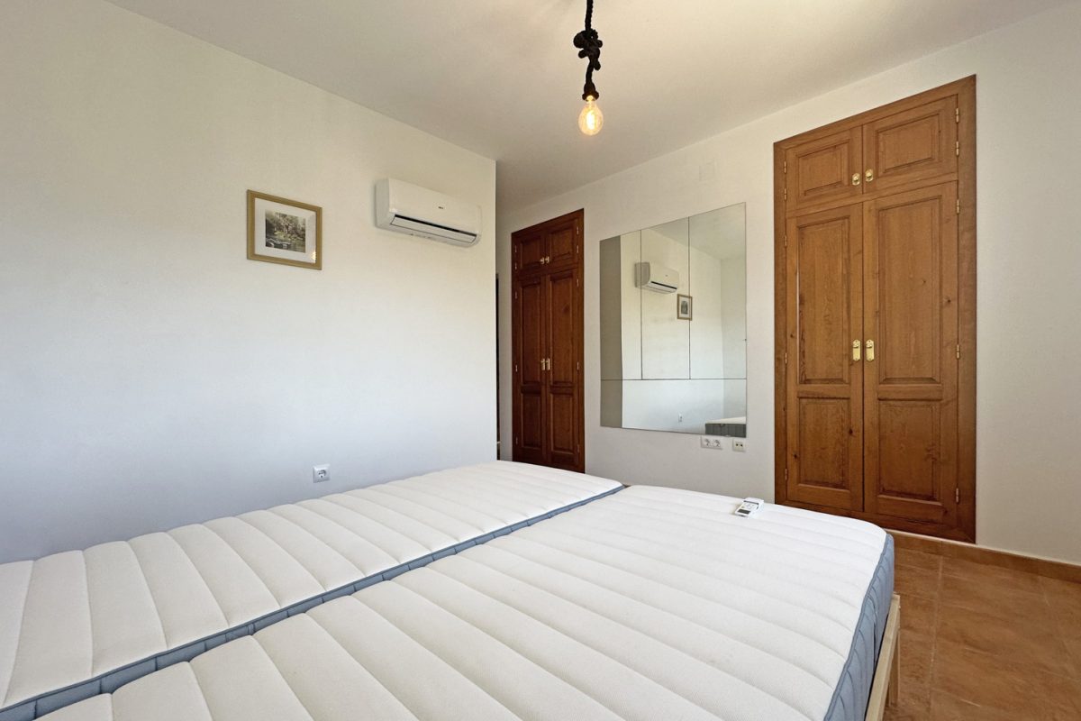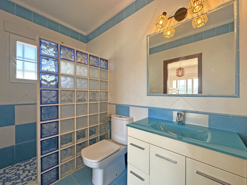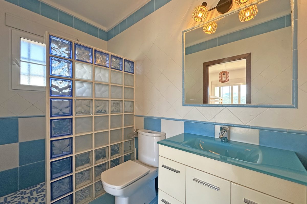 Situated on a generous plot of no less than 2,417 m², the villa is spread over two levels. An automatic gate provides access to a spacious driveway with multiple parking areas on both the upper and lower levels. A few steps lead to the front door, which opens into a hallway on the upper floor. To the left is the master bedroom, complete with a walk-in closet and en-suite bathroom. To the right is a second bedroom with built-in wardrobes and an en-suite bathroom. Both bedrooms open onto a spacious balcony that offers stunning views of the surrounding landscape.