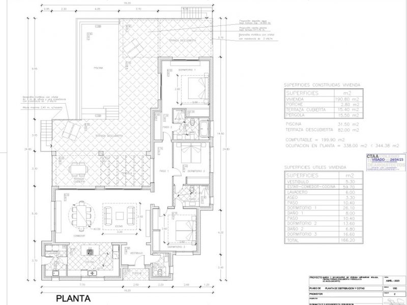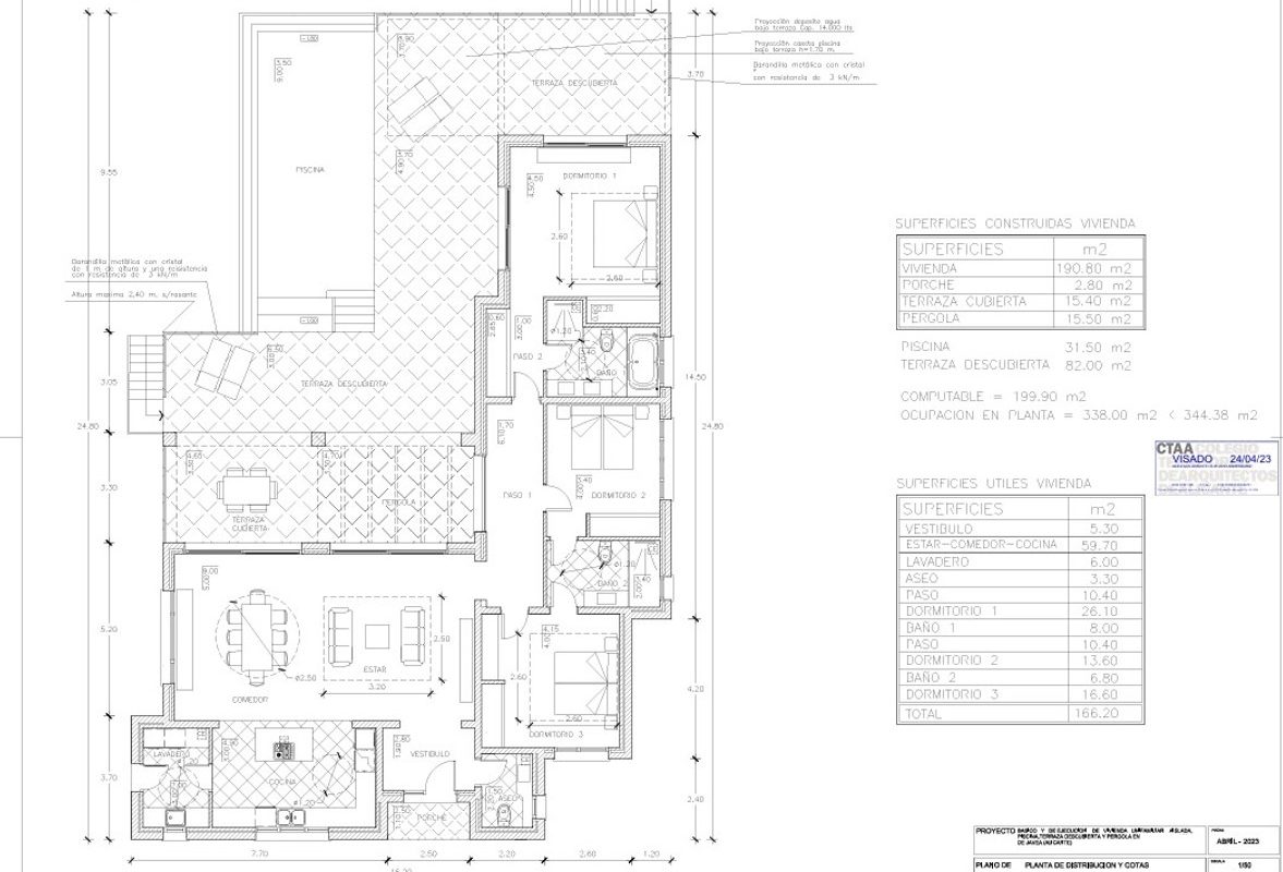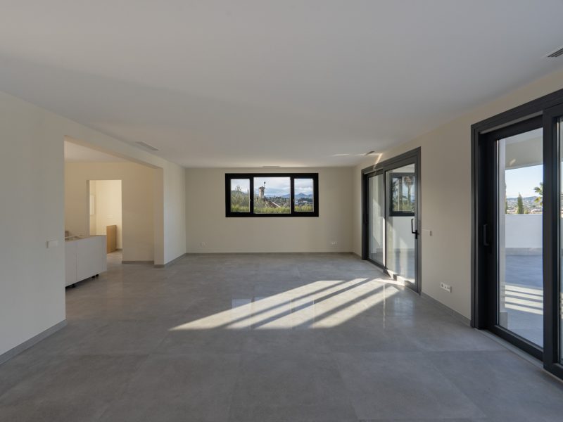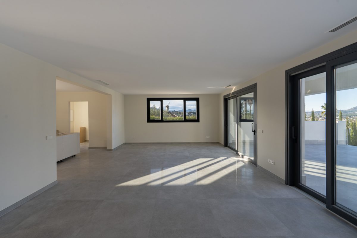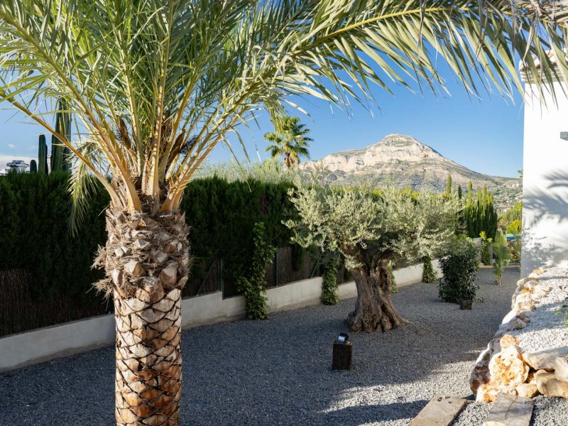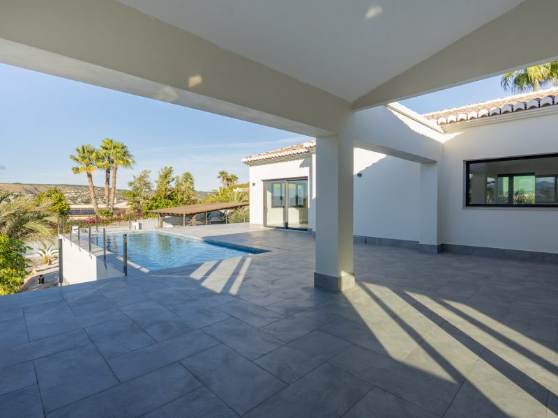This exclusive new build villa, located in the beautiful Piver urbanisation, offers beautifl views of the imposing Montgó and the mountainous interior. The villa is set on a spacious plot of 1,147.94 m2 and is designed entirely on one level for optimal comfort and accessibility. Upon entering, a stylish hall with guest toilet leads to the spacious living-dining room, where large windows provide abundant natural light and a beautiful panorama. Adjacent is a modern, fully equipped kitchen with a practical laundry room that offers direct access to the outside. Sliding windows in the living room open onto the inviting terrace with swimming pool, ideal for enjoying the view and the Mediterranean climate. The sleeping area comprises three bedrooms, including an elegant master bedroom with en-suite bathroom and direct access to the terrace, while the two other bedrooms share a second bathroom. The outdoor area is an oasis of tranquillity with a covered terrace, a pergola, a spacious sun terrace and a low-maintenance Mediterranean garden. With two parking spaces on site and a location just 2 km from the historic centre and 3 km from the coast, this villa combines luxury, privacy and excellent accessibility.