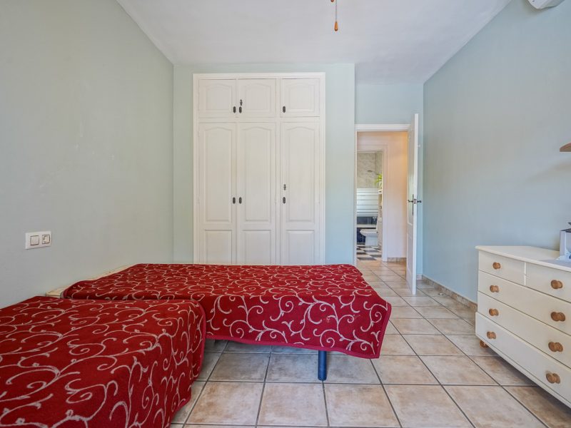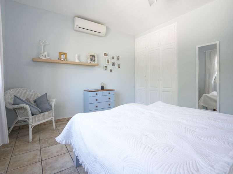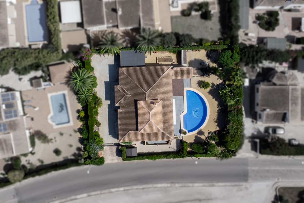 A few steps lead to the veranda at the front door and into an entrance hall. From the hall, you enter the spacious, open kitchen with an adjoining dining area. Next to the dining area is a living room with a fireplace. The eastern side of the villa features a master bedroom with an en-suite bathroom and two bedrooms with a shared bathroom. All bedrooms have built-in wardrobes, shutters and air conditioning. The villa features underfloor heating and a fireplace to guarantee maximum confort all year round. Besides the villa has a laundry room located in between the kitchen and the hallway. Outside, there is a spacious covered terrace on both the south and west side of the villa. There is also a large swimming pool with an outdoor kitchen and an outdoor bathroom. Ideal to spend long summer evenings outdoors. The villa is surrounded by a mature Mediterranean garden and has several parking spaces, a carport and a storage room.