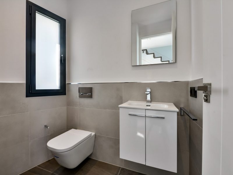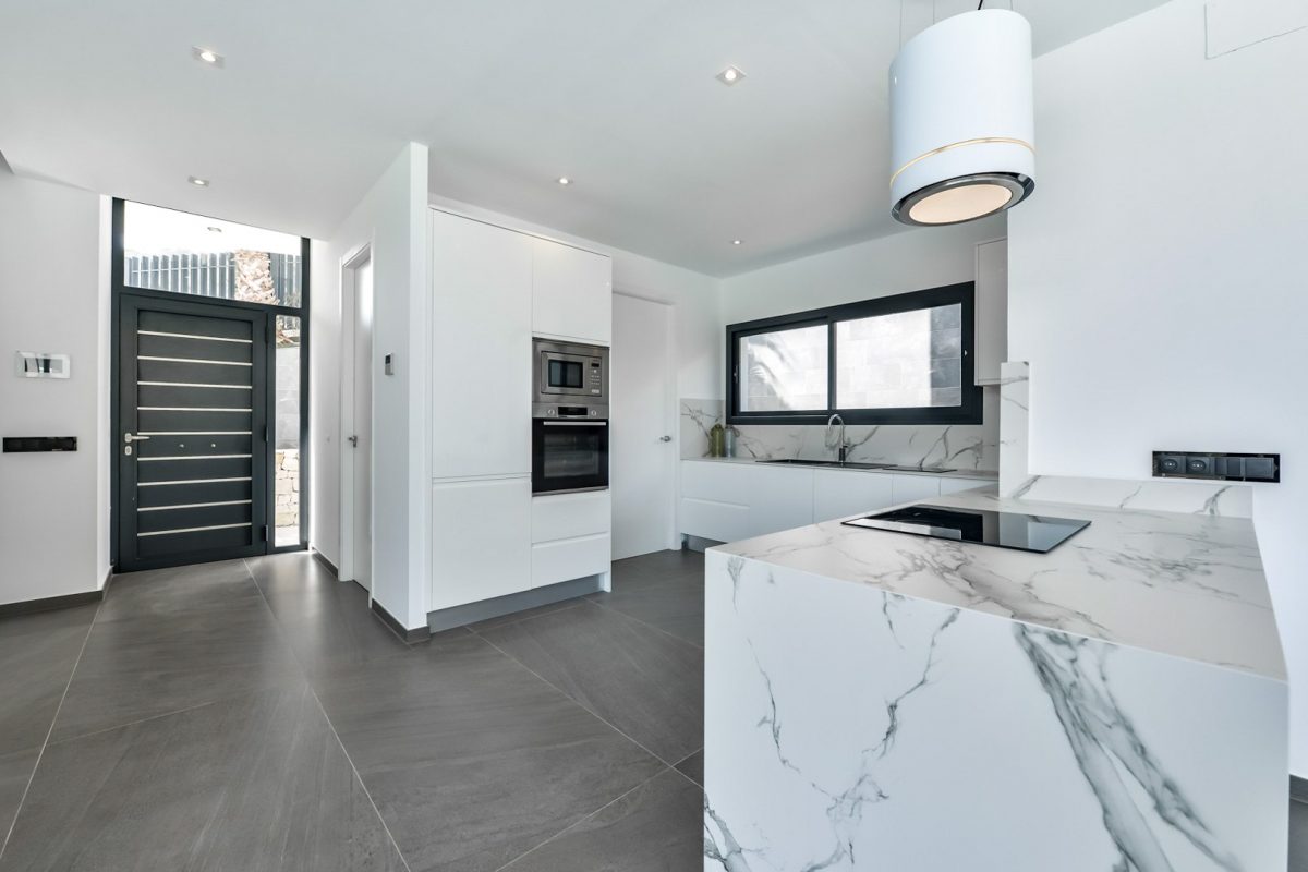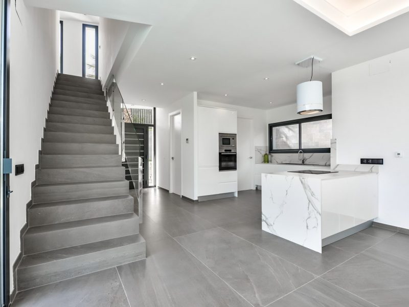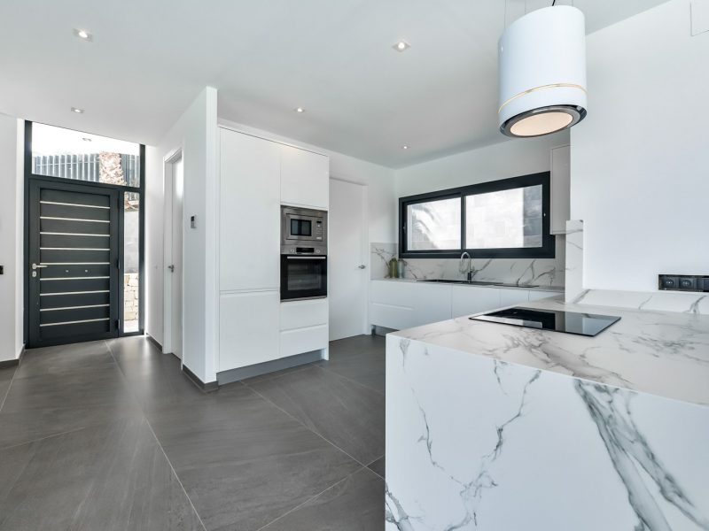 The kitchen is fully equipped with built-in appliances including a ceramic hob, oven, microwave, dishwasher and high-quality bespoke cabinetry. The property is heated by an air-source heat pump supported by solar energy and features a central air conditioning system that efficiently cools and heats the different areas of the house.