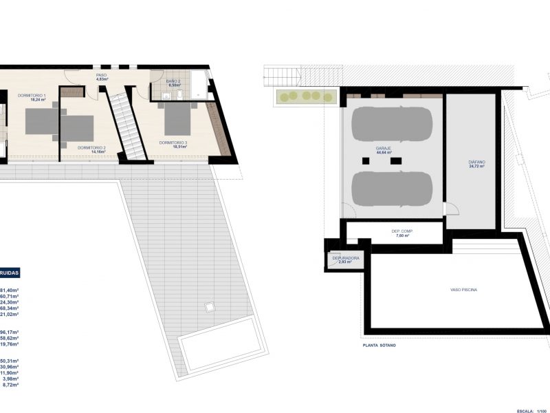 The open sun terrace includes a large infinity-effect swimming pool with wide entrance steps and underwater lighting. On the upper floor there are three spacious bedrooms and two bathrooms, one of which is en suite to the master bedroom. All bedrooms have direct access to the large roof terrace.