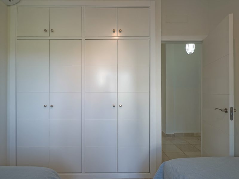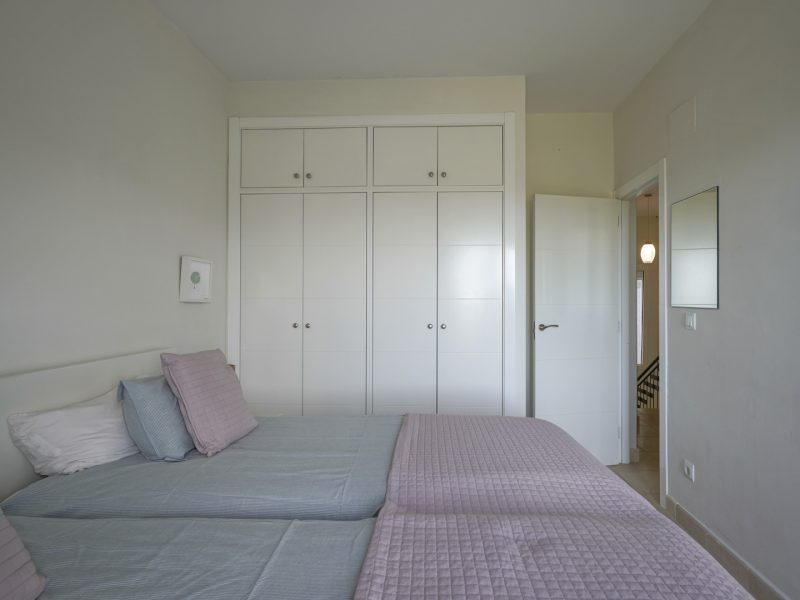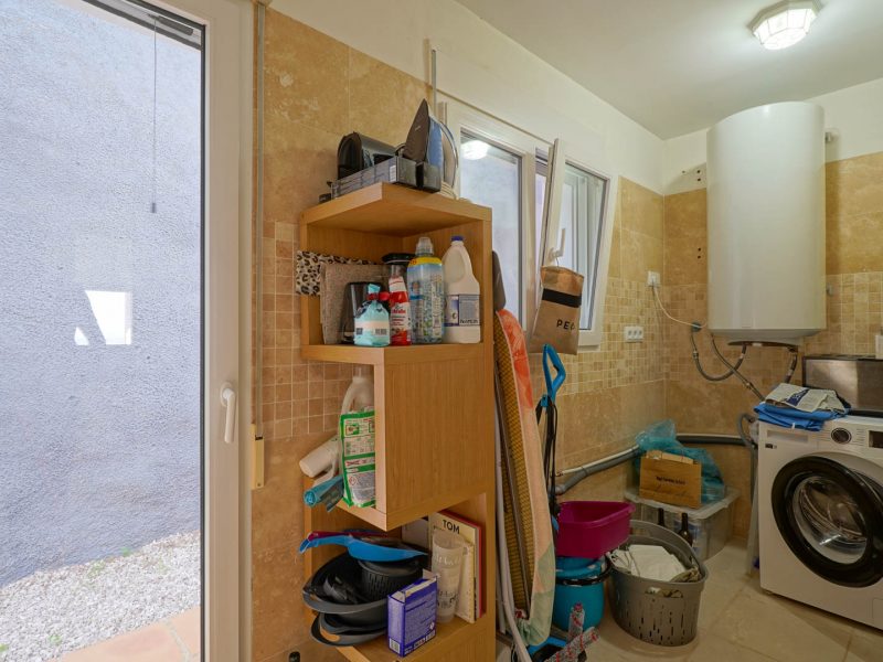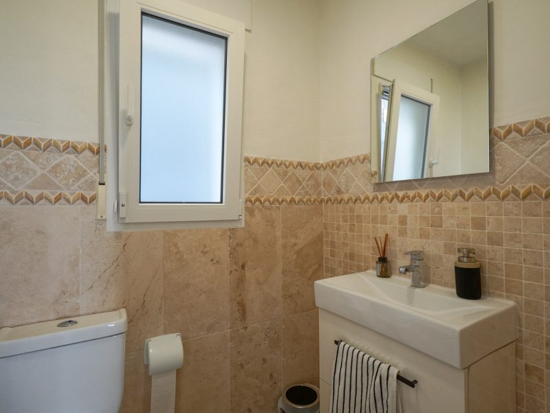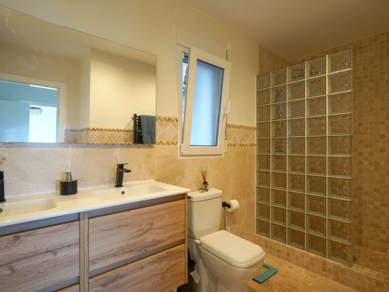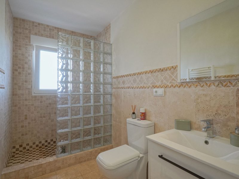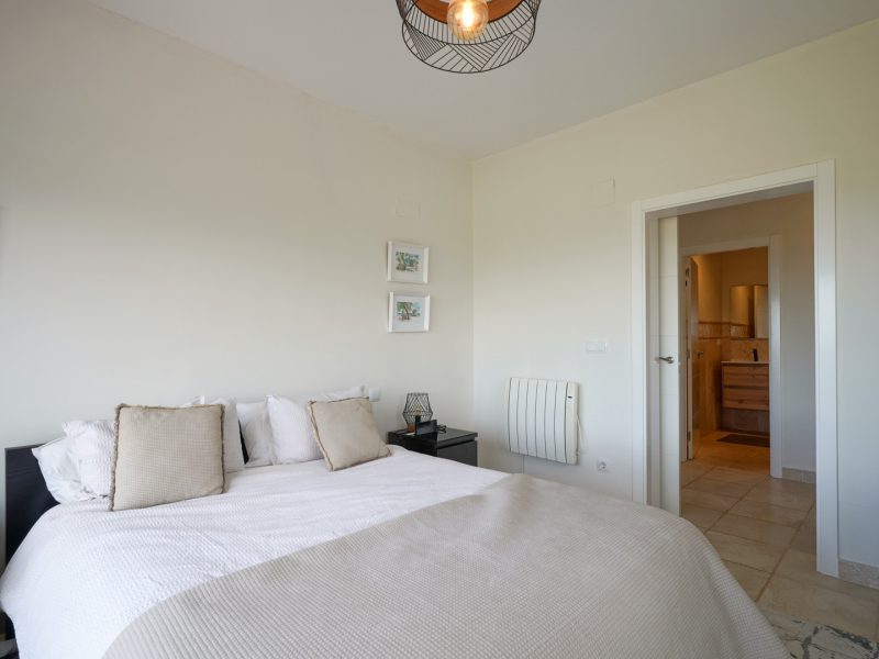 The upper floor houses three spacious double bedrooms, all with built-in wardrobes. The master bedroom has an en-suite bathroom, while the other two bedrooms share a full bathroom. The en-suite bedroom and another bedroom have direct access to a terrace with spectacular views, the perfect place to relax while watching the sunrise or sunset over the Mediterranean.