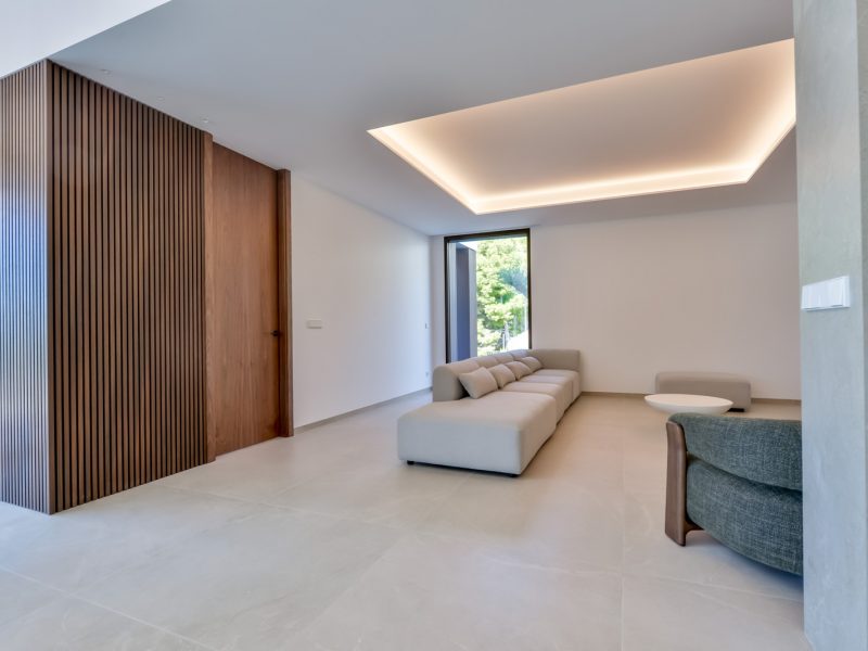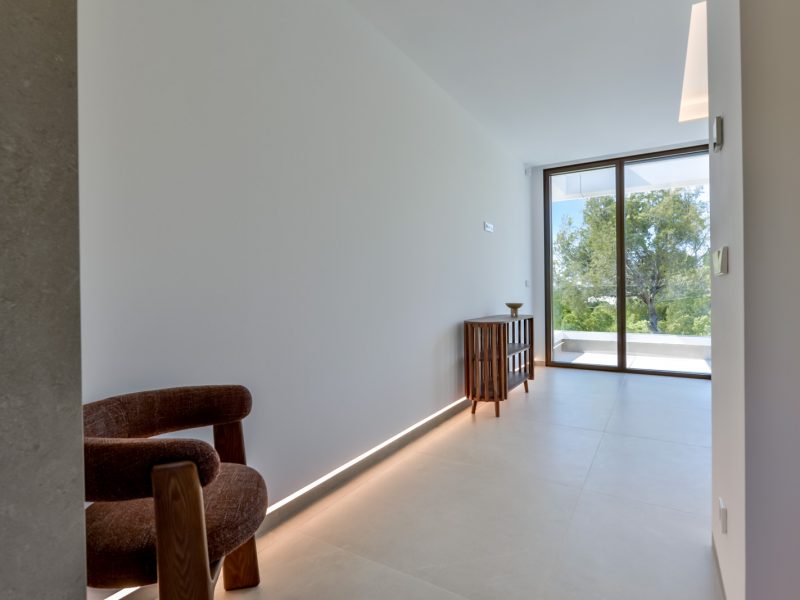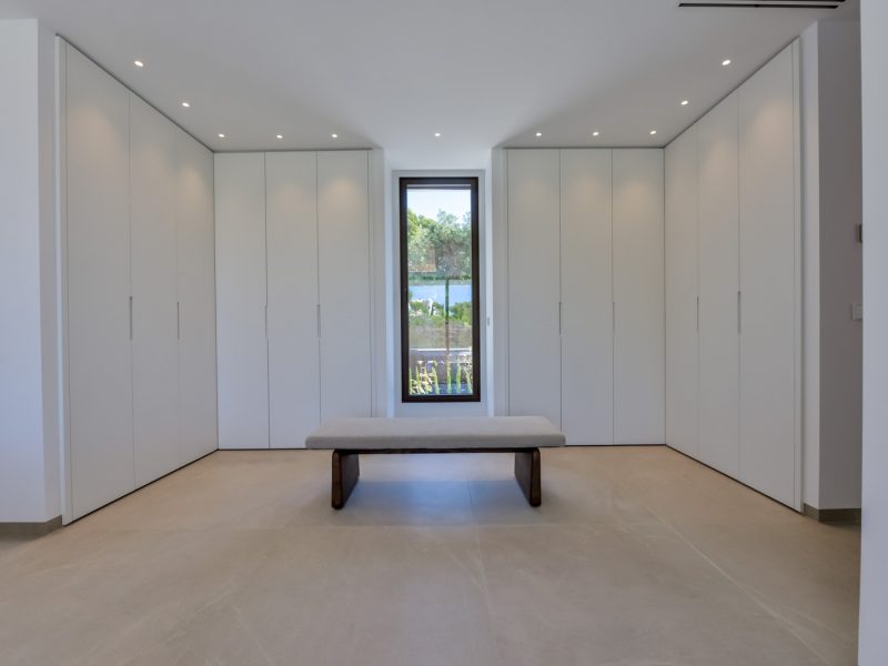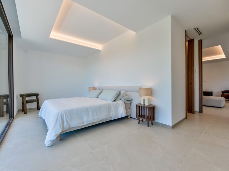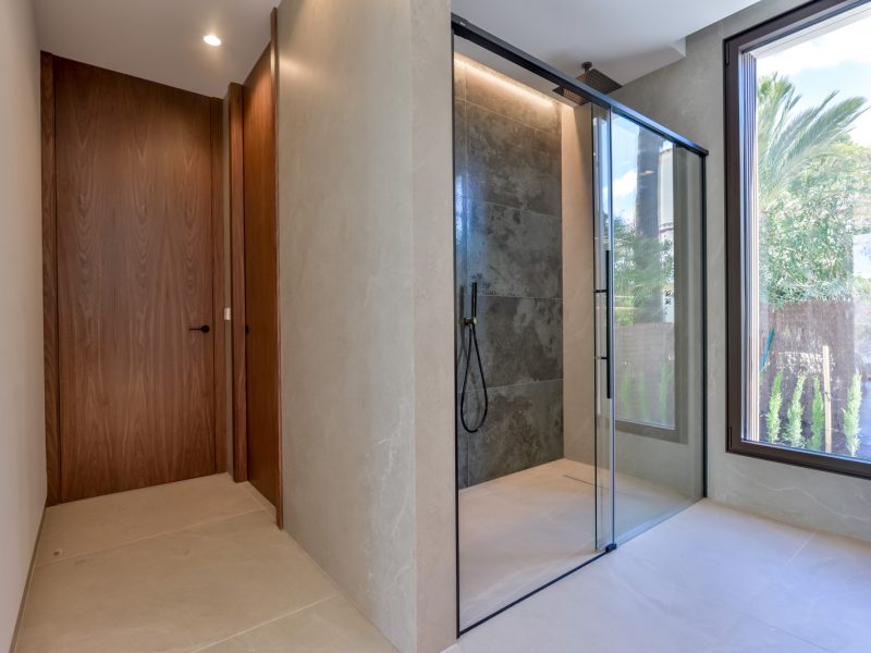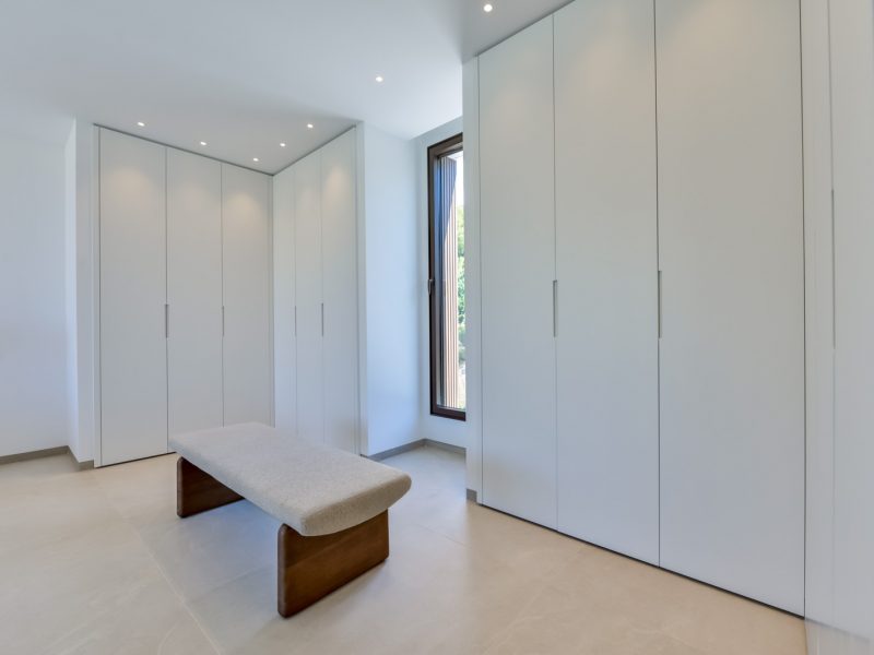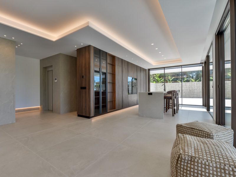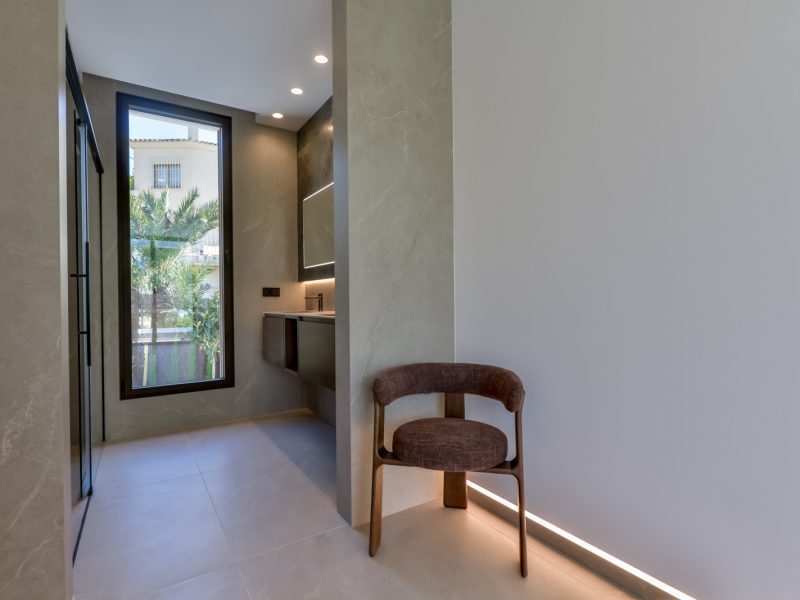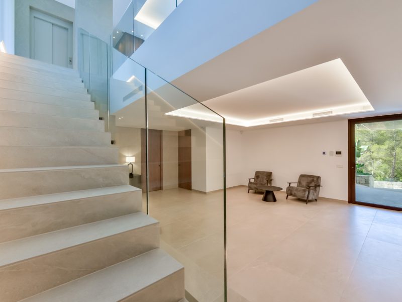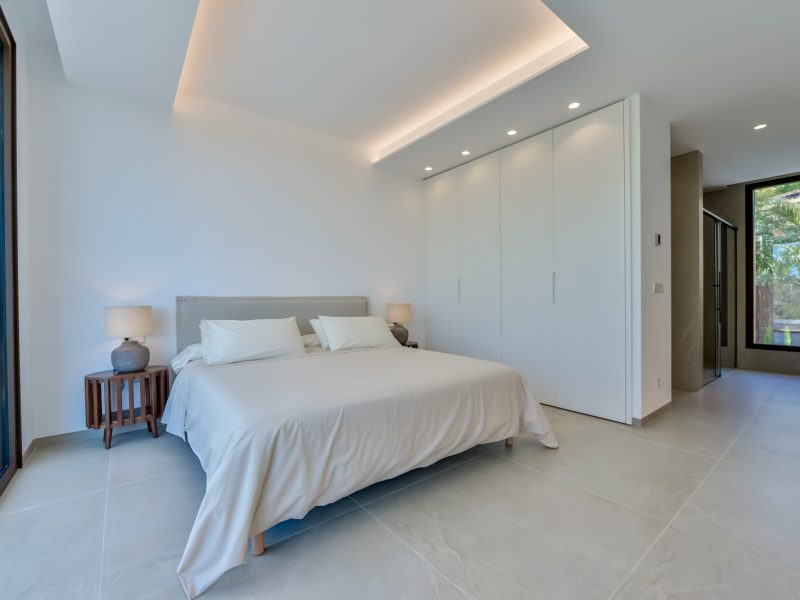 The villa has a total built area of 425 m2, is spread over three floors and is equipped with a lift for maximum comfort. The ground floor comprises a spacious living room with a dining area, a lounge and a fully equipped open kitchen with a kitchen island. In addition, on this floor there is a very spacious double bedroom with an en suite bathroom and a guest toilet. Both from the bedroom and the living room there is direct access to the poolside terrace through sliding windows. The upper floor consists of three double bedrooms, each with an en suite bathroom and with access to a covered terrace. The basement comprises a garage with space for two cars, a laundry room, two technical rooms and a multipurpose room. The villa has both a sun terrace and a covered terrace by the pool and will be surrounded by a beautiful Mediterranean garden with automatic irrigation. The pool is equipped with lighting and there is an outdoor bathroom.
