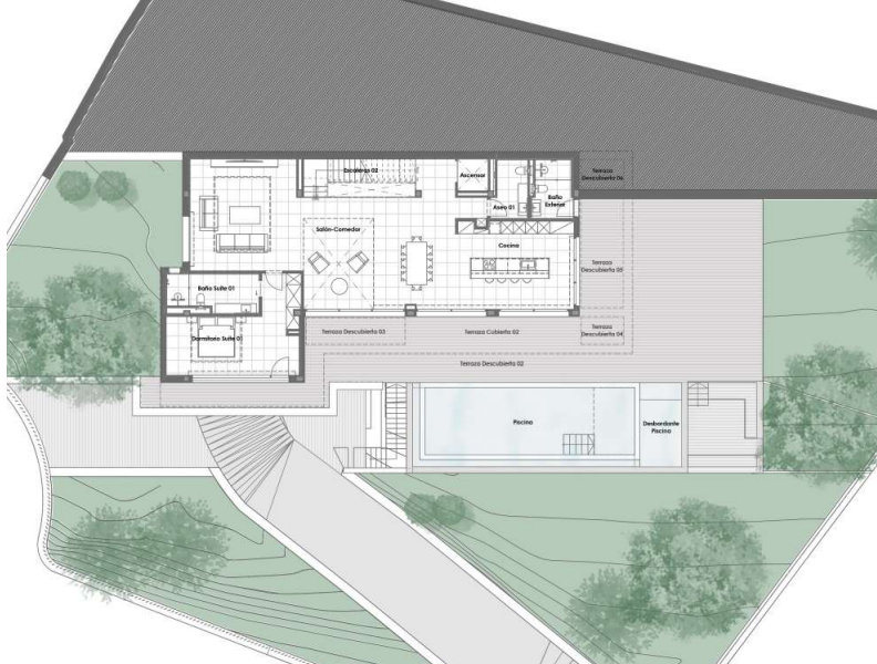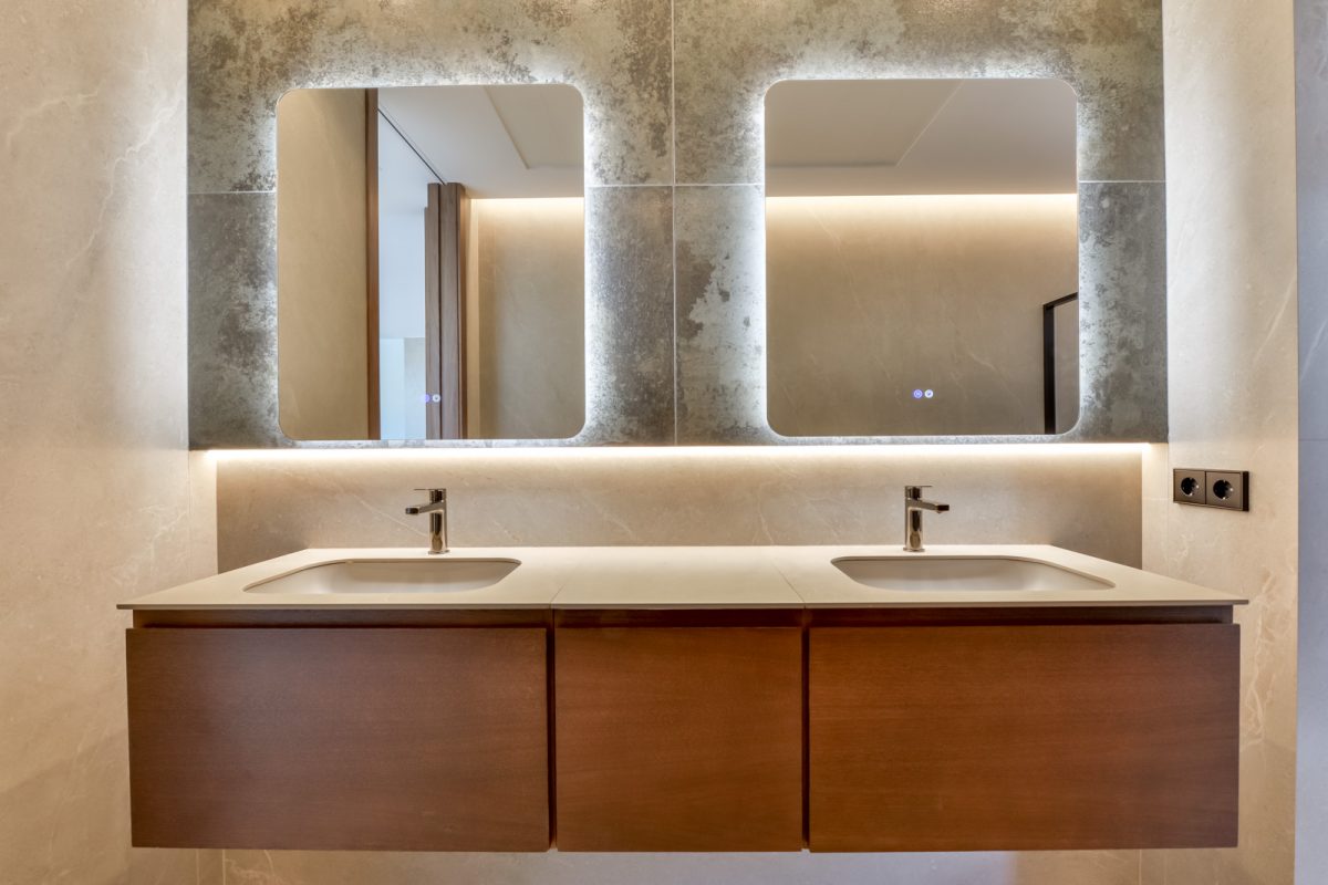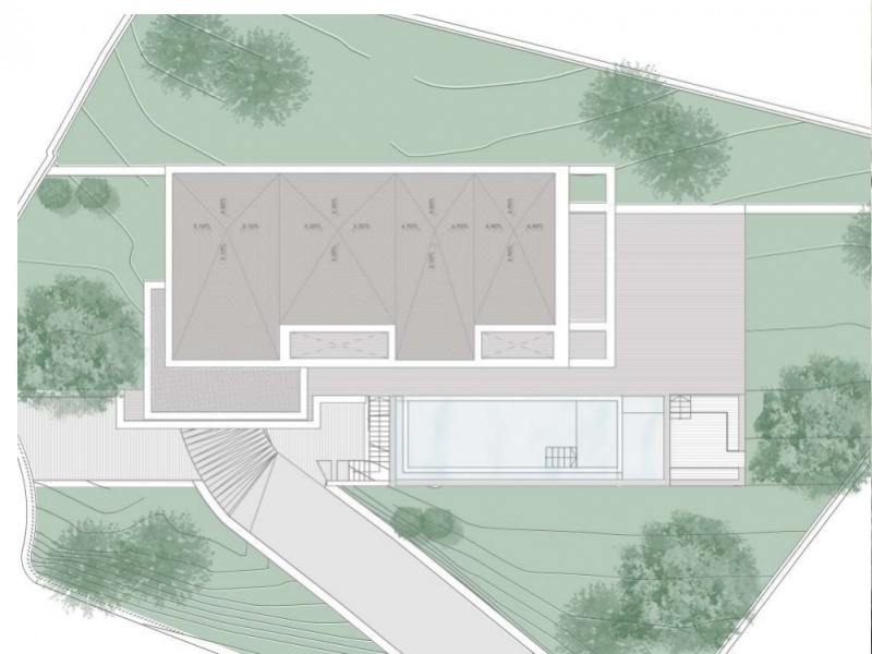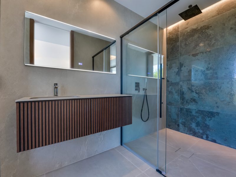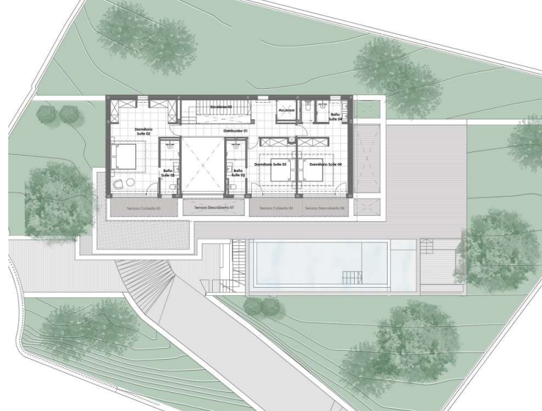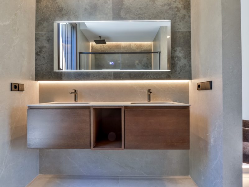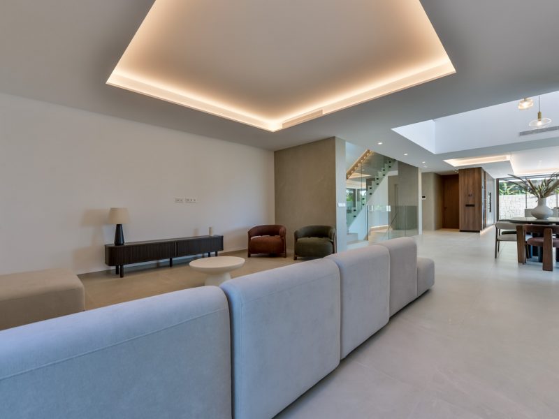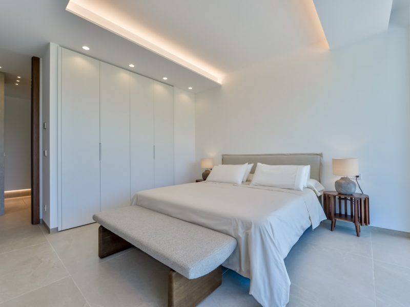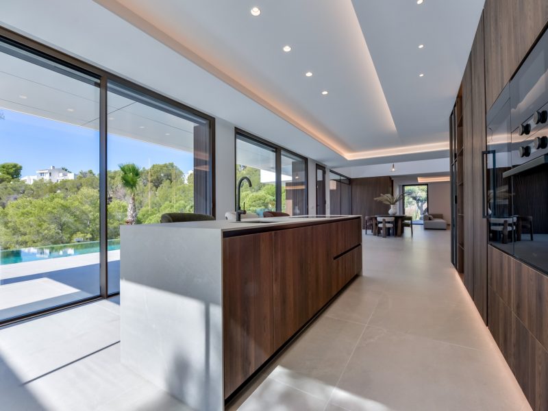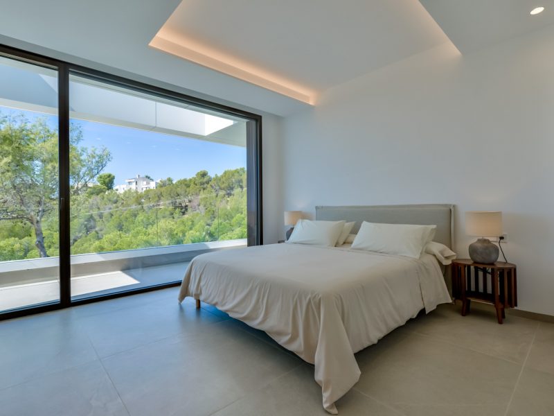 The villa has a total built area of 425 m2, is spread over three floors and is equipped with a lift for maximum comfort. The ground floor comprises a spacious living room with a dining area, a lounge and a fully equipped open kitchen with a kitchen island. In addition, on this floor there is a very spacious double bedroom with an en suite bathroom and a guest toilet. Both from the bedroom and the living room there is direct access to the poolside terrace through sliding windows. The upper floor consists of three double bedrooms, each with an en suite bathroom and with access to a covered terrace. The basement comprises a garage with space for two cars, a laundry room, two technical rooms and a multipurpose room. The villa has both a sun terrace and a covered terrace by the pool and will be surrounded by a beautiful Mediterranean garden with automatic irrigation. The pool is equipped with lighting and there is an outdoor bathroom.