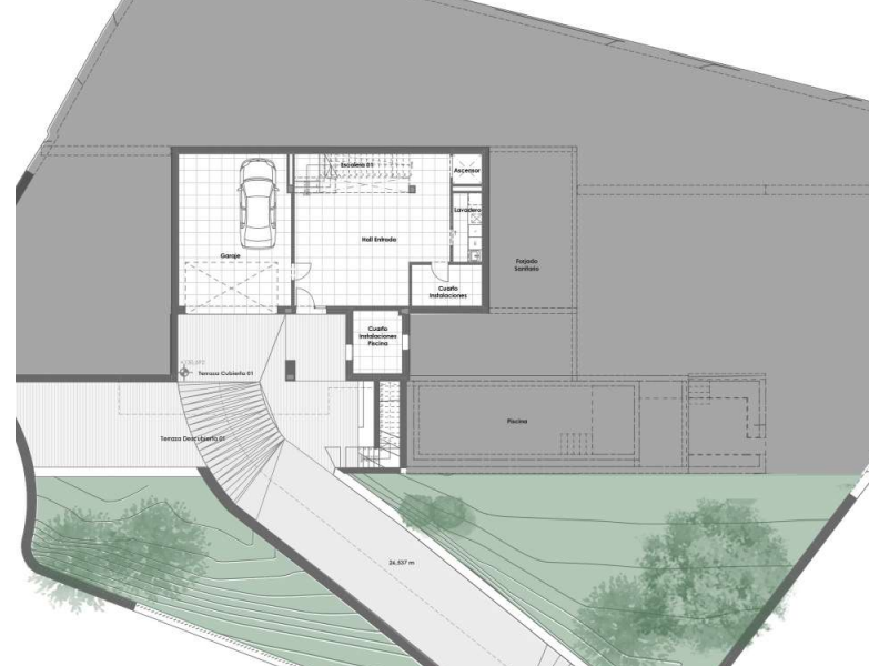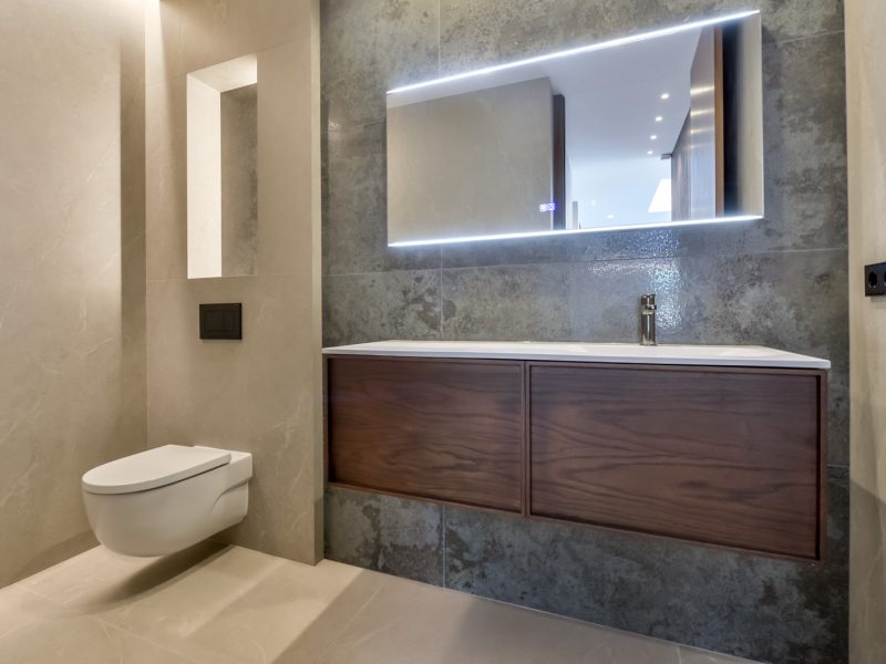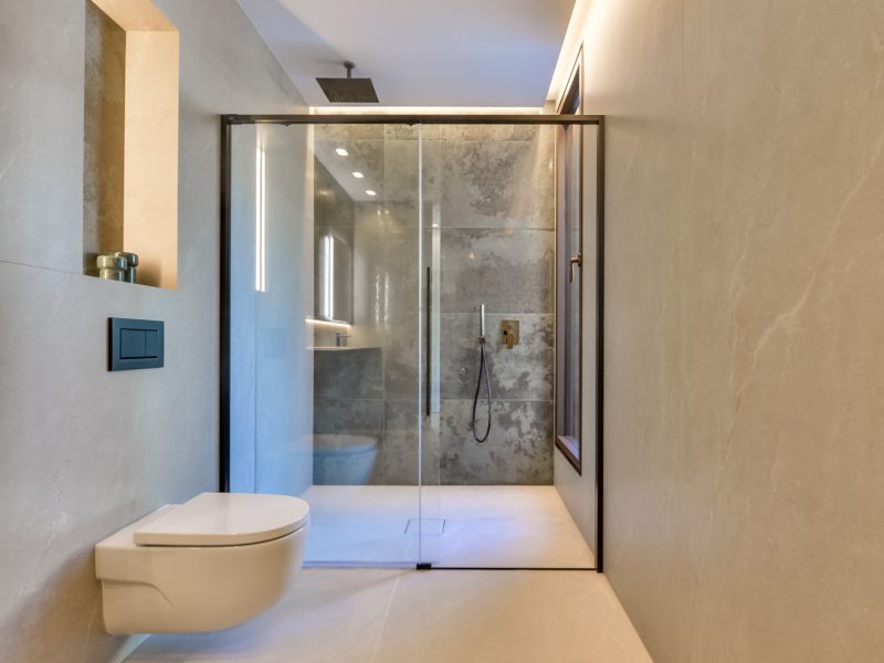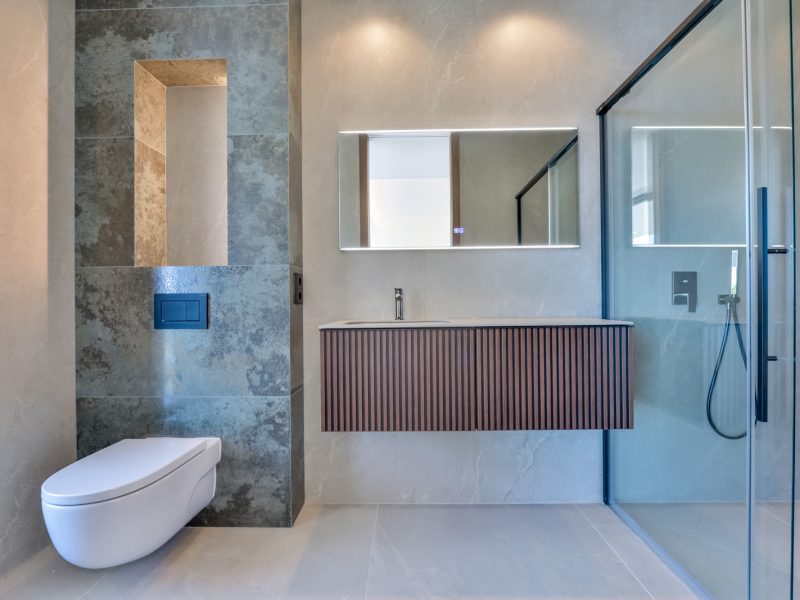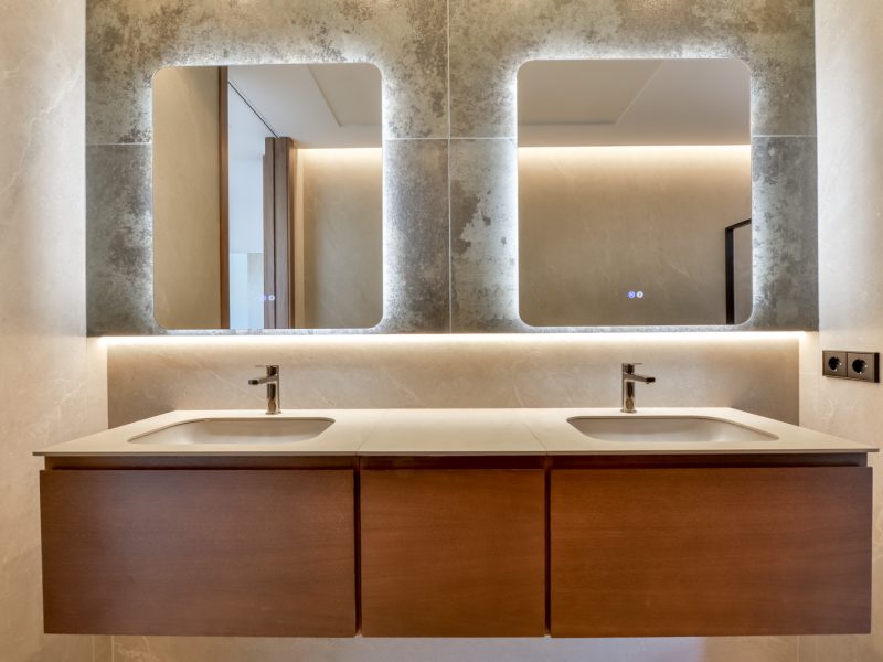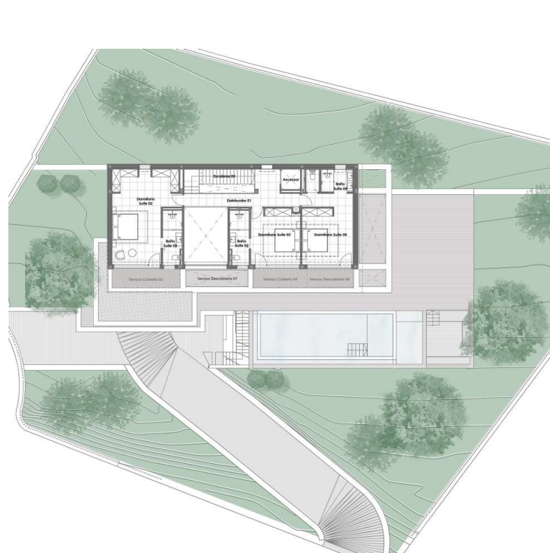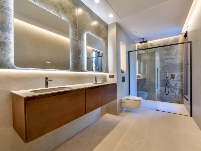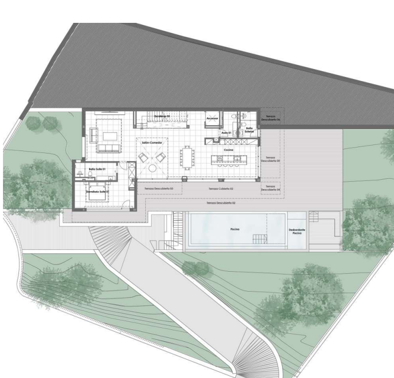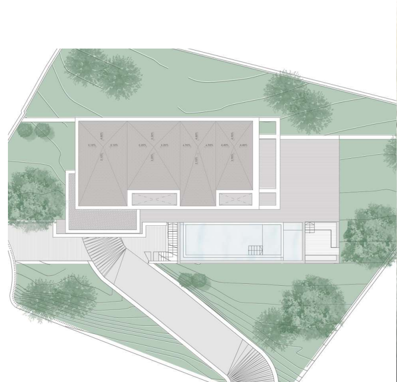 The villa has a total built area of 425 m2, is spread over three floors and is equipped with a lift for maximum comfort. The ground floor comprises a spacious living room with a dining area, a lounge and a fully equipped open kitchen with a kitchen island. In addition, on this floor there is a very spacious double bedroom with an en suite bathroom and a guest toilet. Both from the bedroom and the living room there is direct access to the poolside terrace through sliding windows. The upper floor consists of three double bedrooms, each with an en suite bathroom and with access to a covered terrace. The basement comprises a garage with space for two cars, a laundry room, two technical rooms and a multipurpose room. The villa has both a sun terrace and a covered terrace by the pool and will be surrounded by a beautiful Mediterranean garden with automatic irrigation. The pool is equipped with lighting and there is an outdoor bathroom.