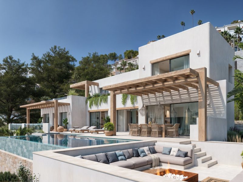 This exclusive Ibiza-style villa project is located in the modern villa district of Racó de Galeno in Benissa and offers breathtaking panoramic views of the Mediterranean Sea. The villa combines modern elegance with Mediterranean charm and is being built with high-quality materials and finishes of the highest standard.