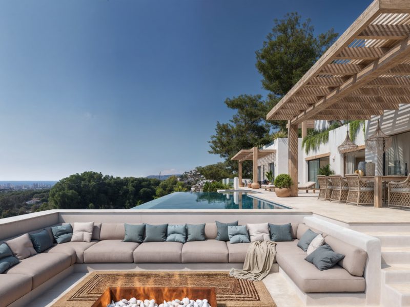 The kitchen will be finished in the characteristic Ibiza style, with natural tones and high-quality finishes, including built-in appliances. The bathrooms are finished in mortar, microcement or tiling, with ROCA sanitary ware and FIMA SPILLO taps in elegant matt black. The infinity pool is lined with Bassetes mosaic tiles and is pre-installed for heating.