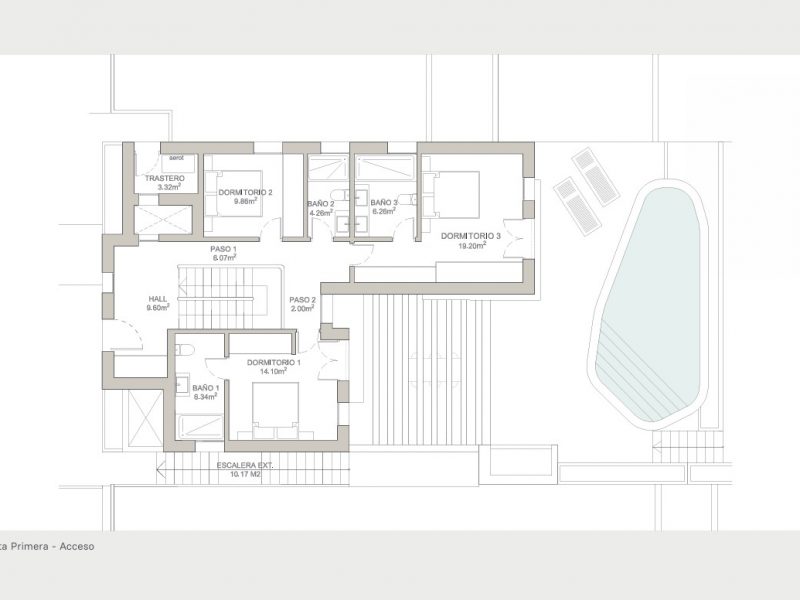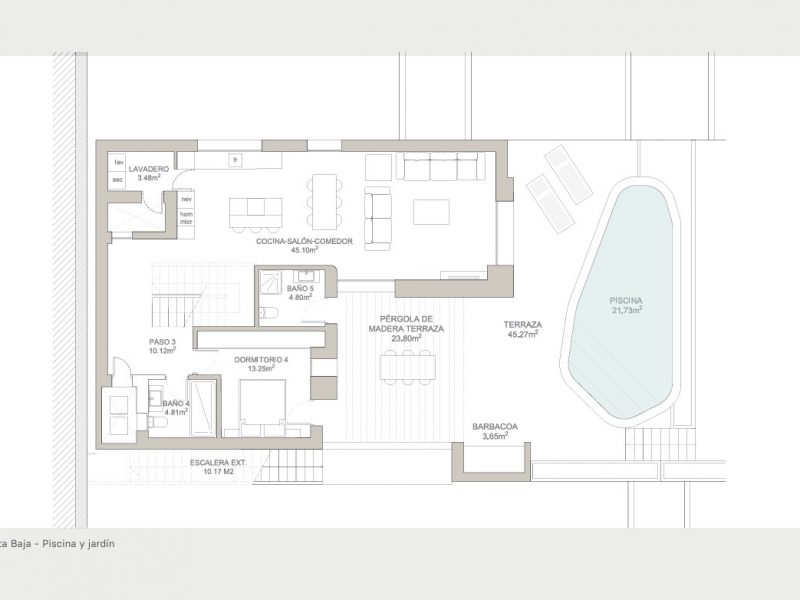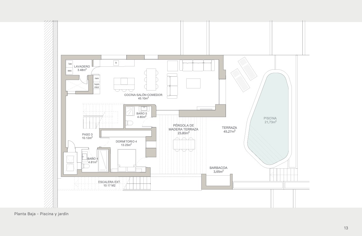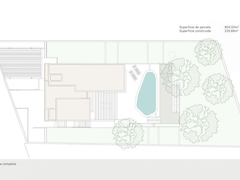 You enter the upper floor into a spacious hall, on this floor there are three spacious double bedrooms, each with an en-suite bathroom. The ground floor houses the living area, consisting of a spacious living-dining room with an open kitchen with a cooking island and a laundry room. For added comfort, there is a fourth bedroom with an en-suite bathroom on this floor. Both the living room and the bedroom offer direct access to the terrace by the pool, which also has a barbecue area. In addition, the villa also has a fully equipped outdoor bathroom, a storage room and parking space for two cars. For optimal comfort, both hot/cold air conditioning and underfloor heating are installed, which can be controlled via the AIRZONE system.