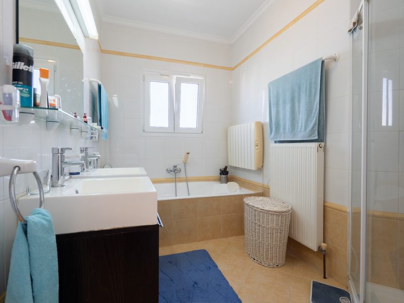 The main living area is located on the upper floor and consists of a spacious living-dining room with fireplace, a large kitchen with utility room, a bedroom with en-suite bathroom, an office and a second bathroom. Adjacent to the living room is a naya with access to a spacious sun terrace. From the office, a staircase leads to the lower level where there is an additional storage room. This floor also features a spacious guest apartment with independent entrance, consisting of a living-dining room, kitchen, laundry room, two double bedrooms and two bathrooms. The swimming pool is also located on this level, surrounded by a large terrace, partly covered. The villa is equipped with central heating via radiators and hot/cold air conditioning.