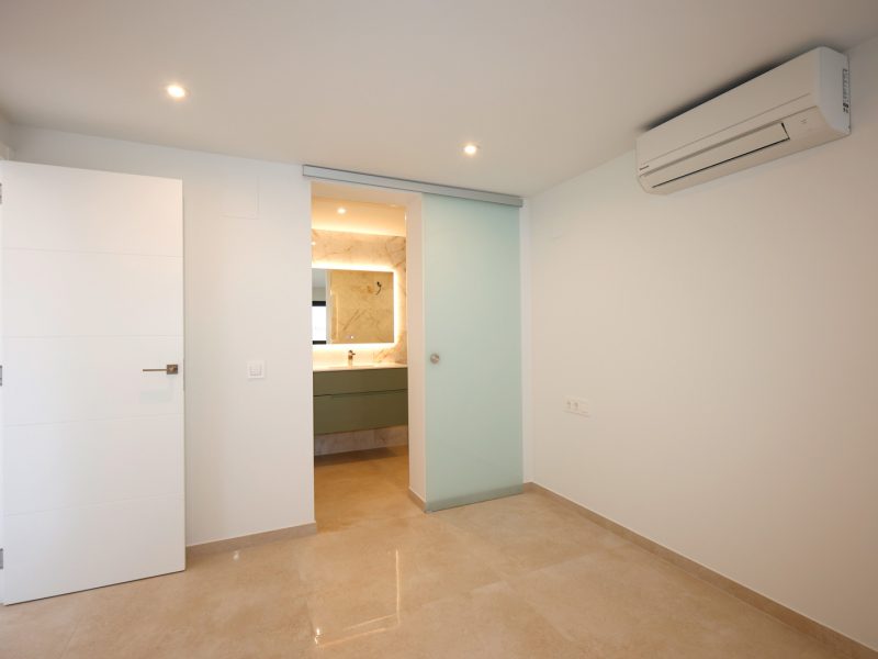 The upper floor has underfloor heating, and both homes have air conditioning with a heat pump. The kitchens are fully equipped with Bosch appliances: refrigerator, oven, dishwasher, washing machine, induction hob, extractor hood, and Silestone countertop. LED lighting and bathrooms with glass partitions and designer vanity units provide a contemporary and functional style.
