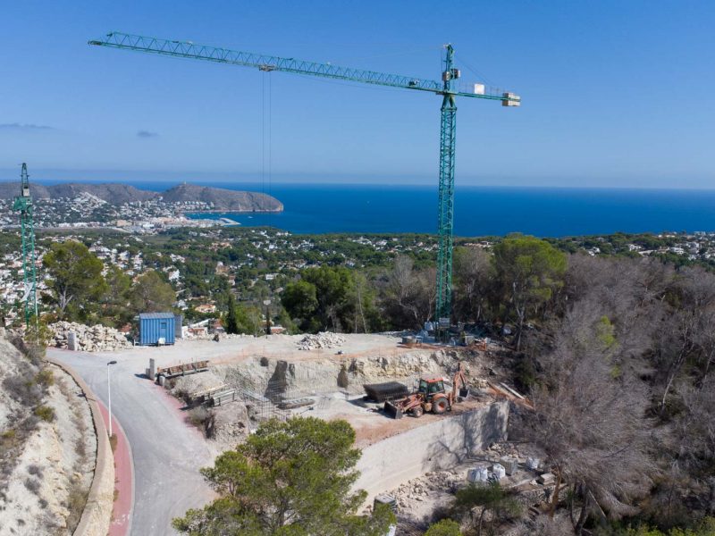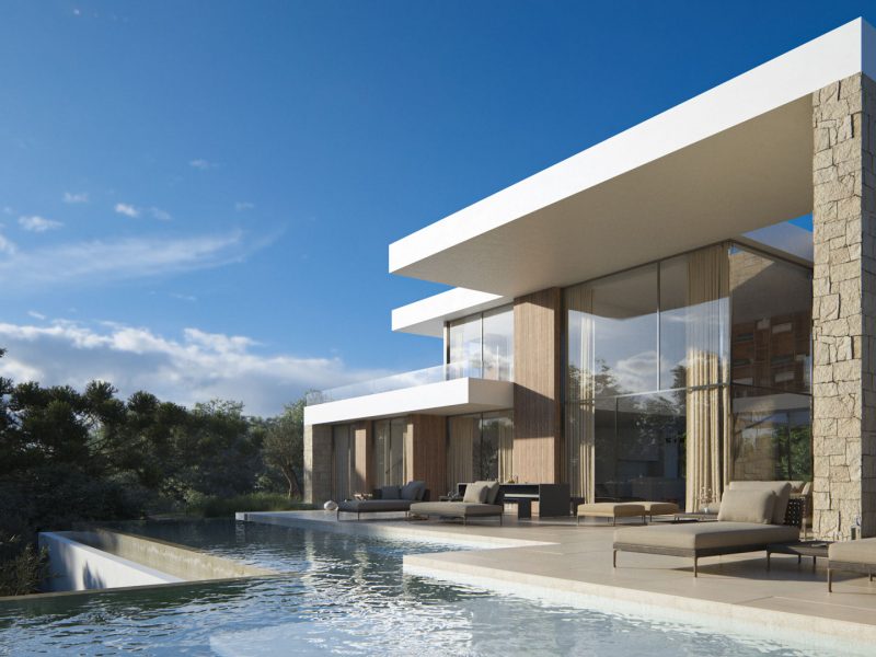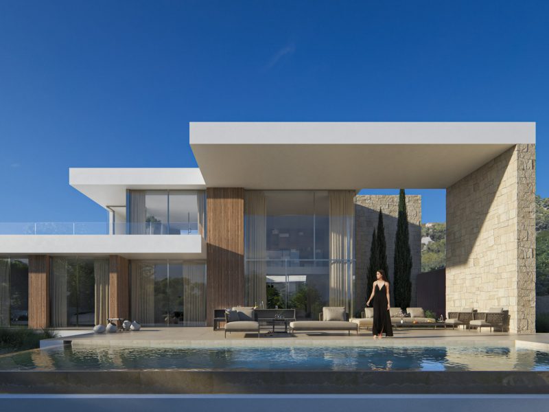 Under construction, this impressive villa sits atop a hill, offering unparalleled panoramic views of the sea and mountains. Its design combines functionality with an exquisite contemporary architectural style, where the spaces open fully to the exterior, blending with the landscape.