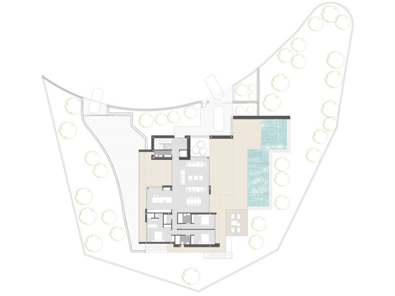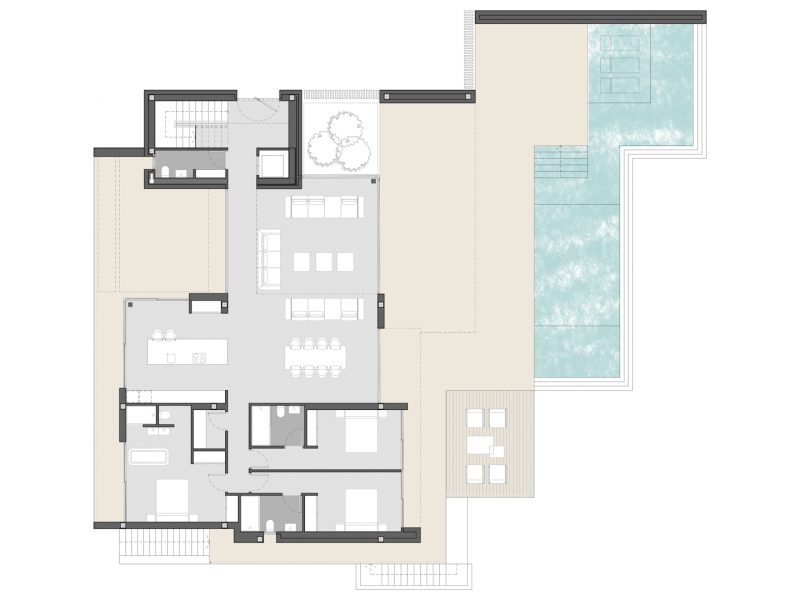 The ground floor features a large open-plan living and dining area, connected by large windows to the terraces and outdoor area. The living room also opens to the rear, allowing views in both directions. The bedrooms maintain this same connection with nature: two face east and the master bedroom on the ground floor faces west, all with direct access to the exterior.