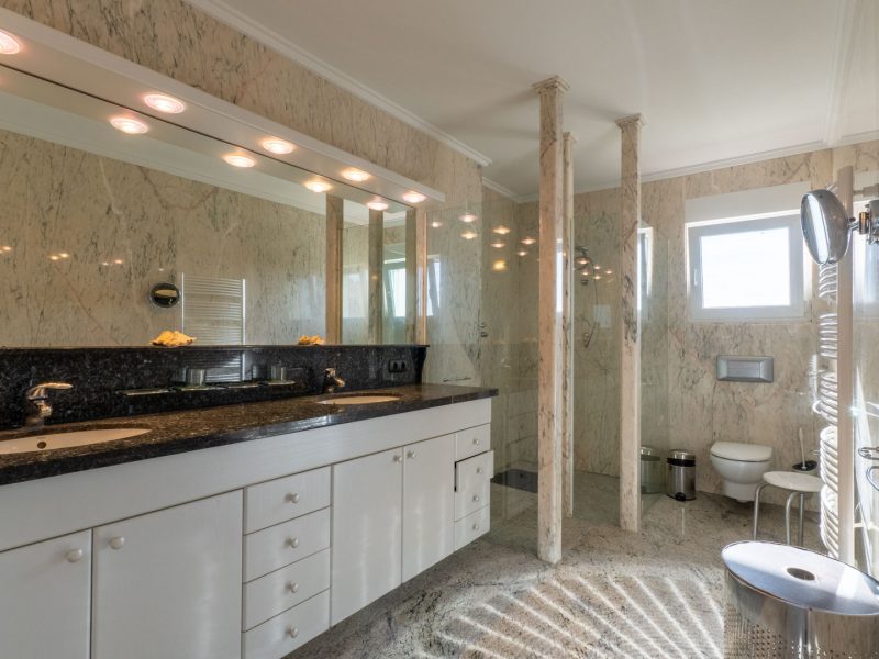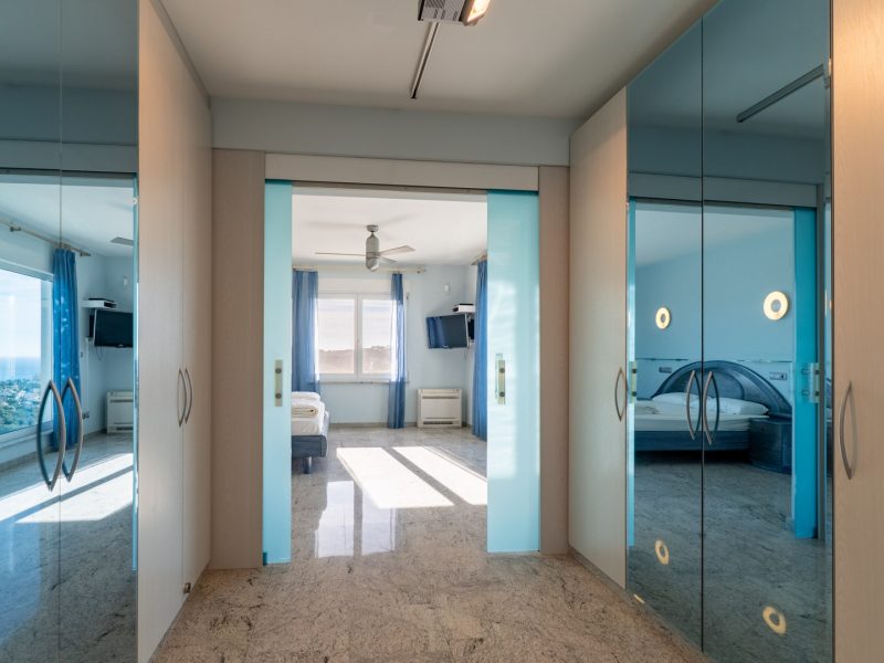 The lower floor houses three additional bedrooms, all with direct access to the terrace and sea views, as well as three bathrooms (one en-suite). This floor also includes a wellness area with a sauna, ideal for moments of relaxation. The exterior is designed to enjoy the Mediterranean climate year-round: a fully equipped outdoor kitchen, a spacious chill-out terrace, a heated infinity pool that visually merges with the sea, and a private jacuzzi. The property also includes a spacious garage with room for several vehicles.