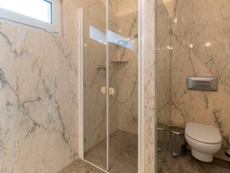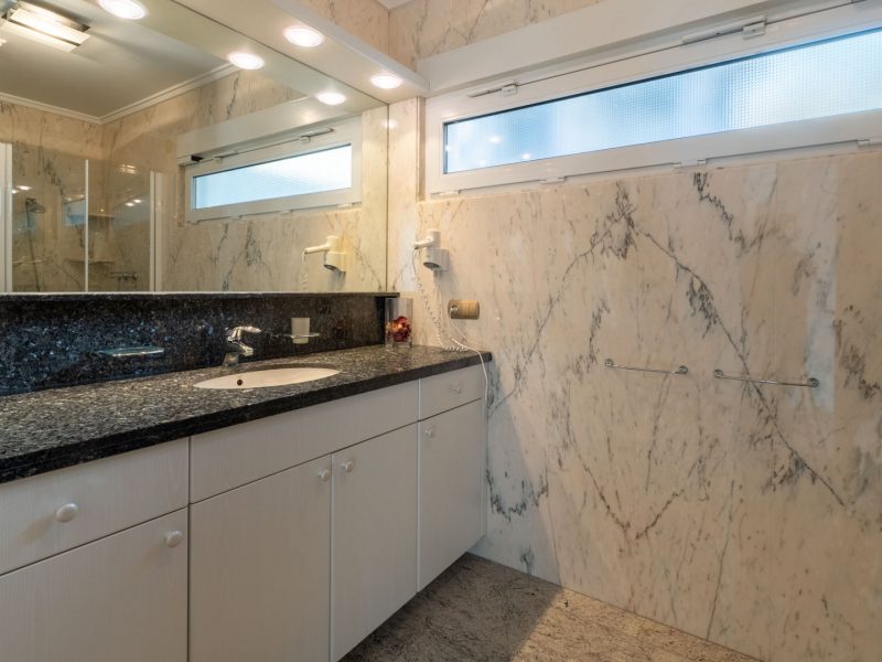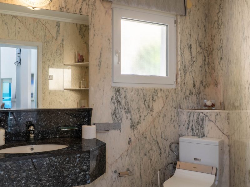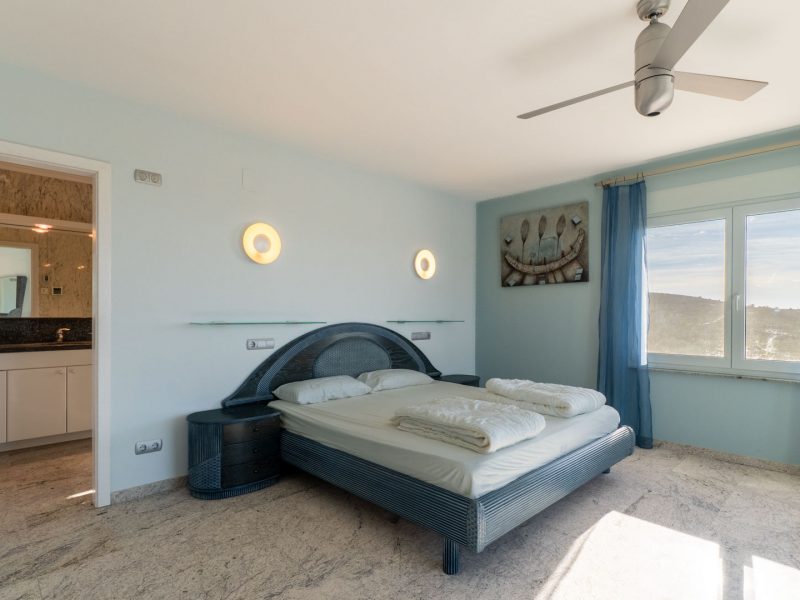 On the main floor of the villa, an elegant entrance hall with high ceilings welcomes you and leads to a spacious and bright living-dining room with large windows that frame the breathtaking views. The modern, fully equipped open-plan kitchen is complemented by a practical laundry room. Also on this floor is the master bedroom, which features an en-suite bathroom, dressing room, and direct access to the terrace, as well as a guest toilet.