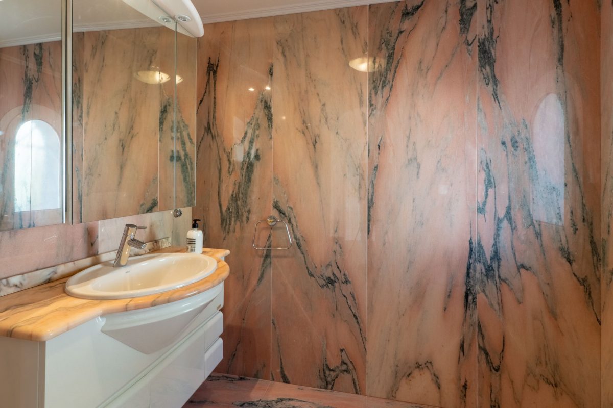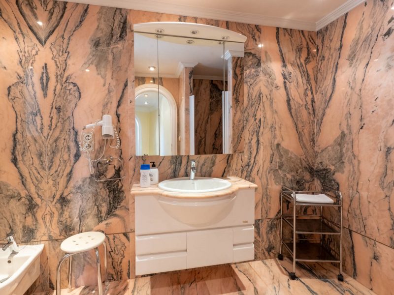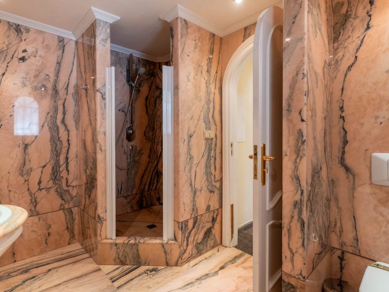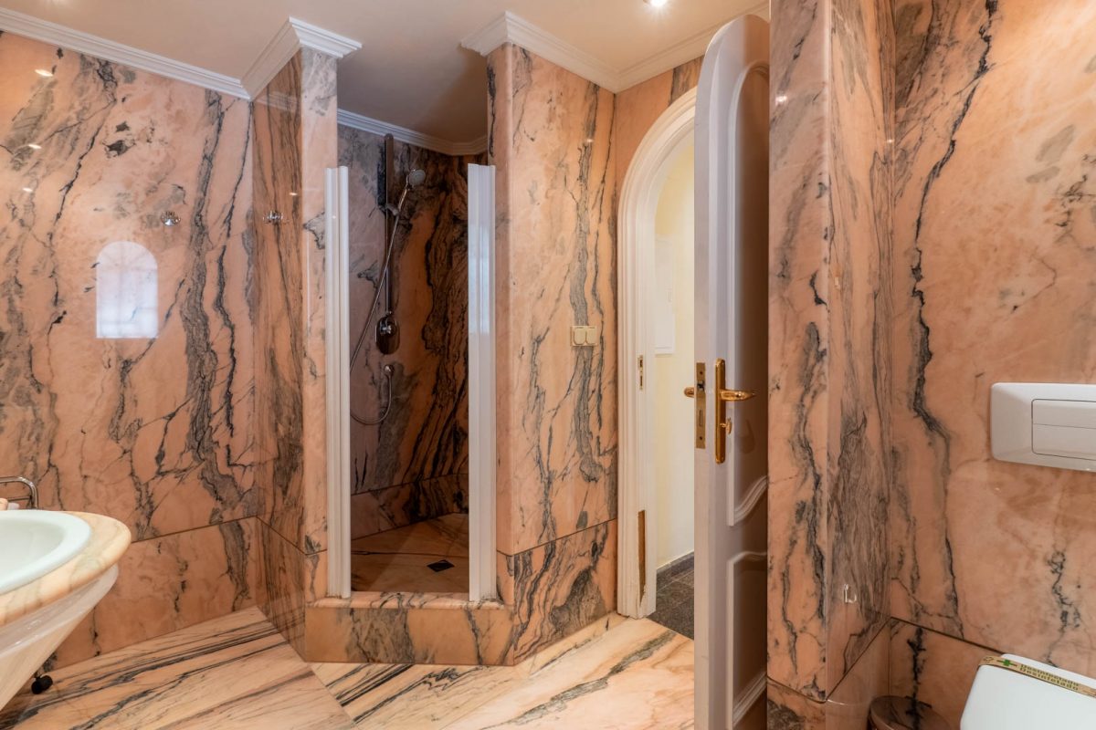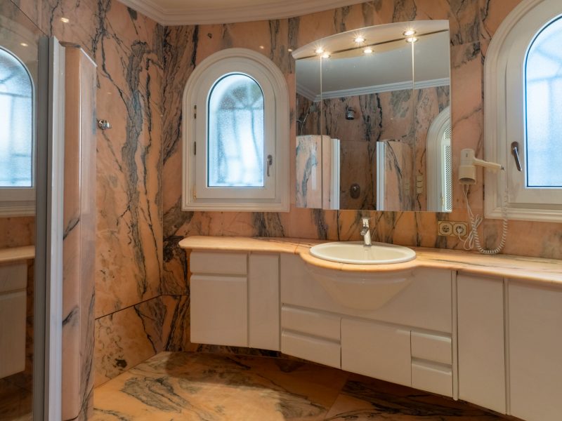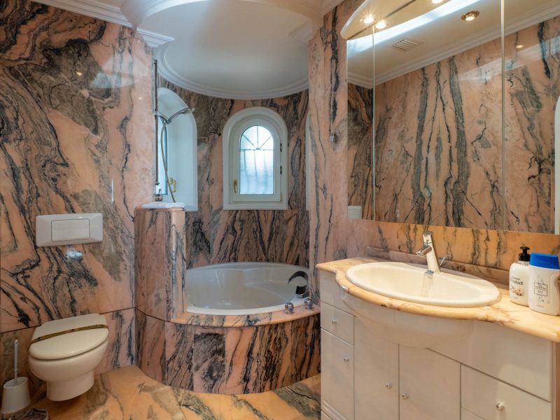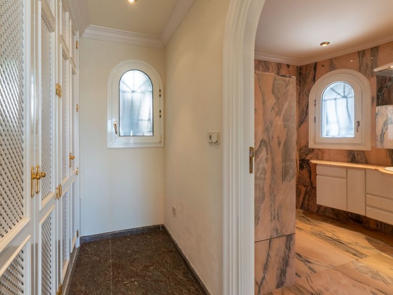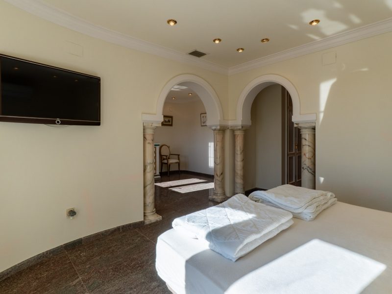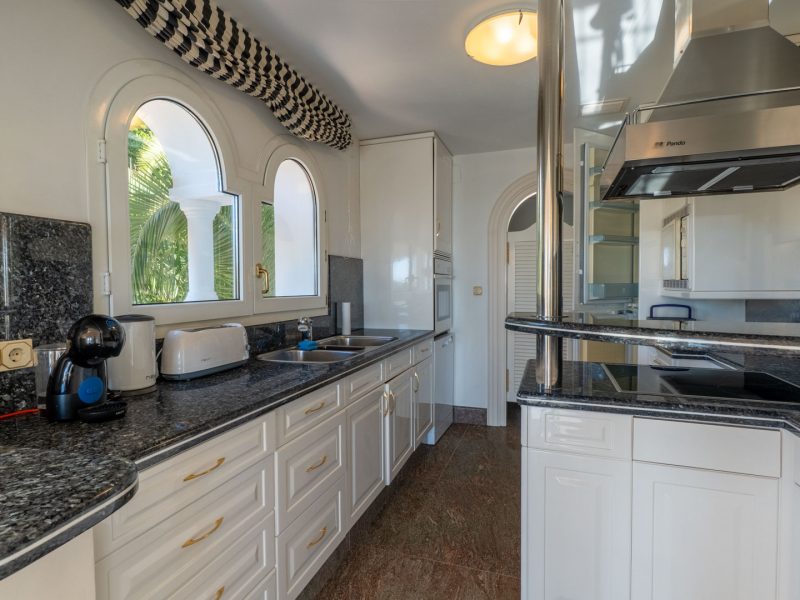 The exterior is a true Mediterranean oasis. The impressive swimming pool becomes the heart of outdoor living, surrounded by relaxation areas with sofas and shaded spaces that invite you to unwind while gazing at the blue horizon. The fully equipped summer kitchen, located opposite the pool, is the perfect place to enjoy al fresco meals with family and friends. The property also includes a private sauna, a touch of wellness that further enhances the experience of living in this magnificent villa.