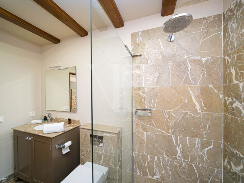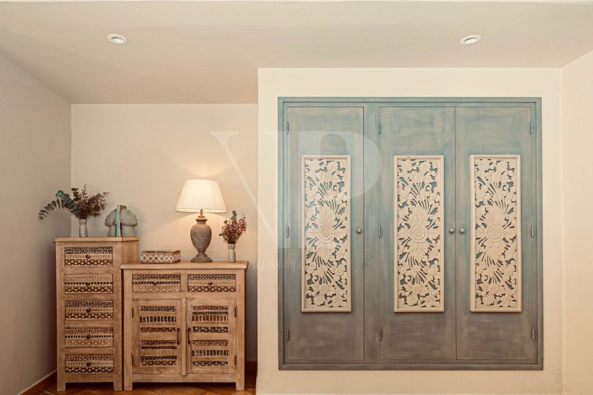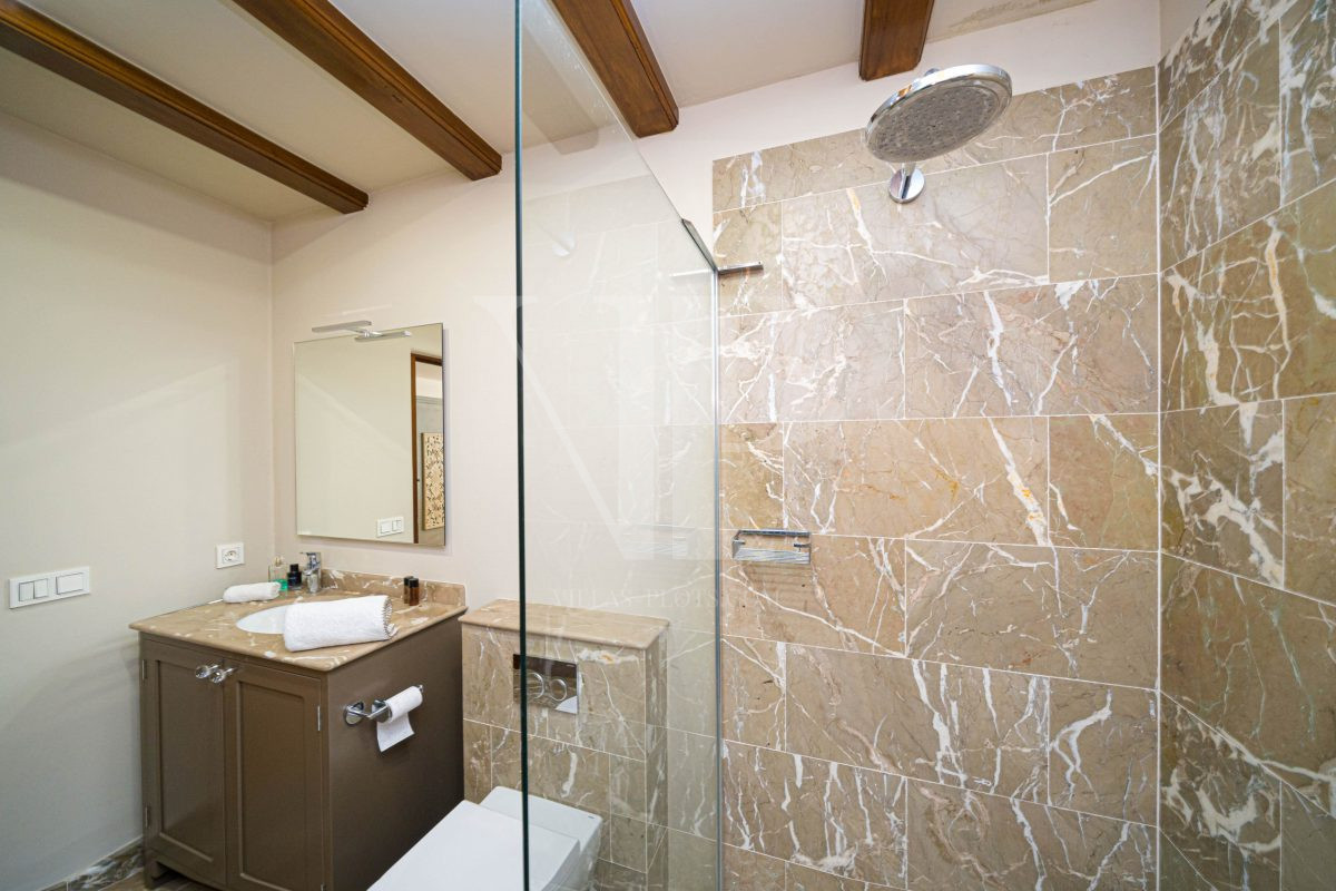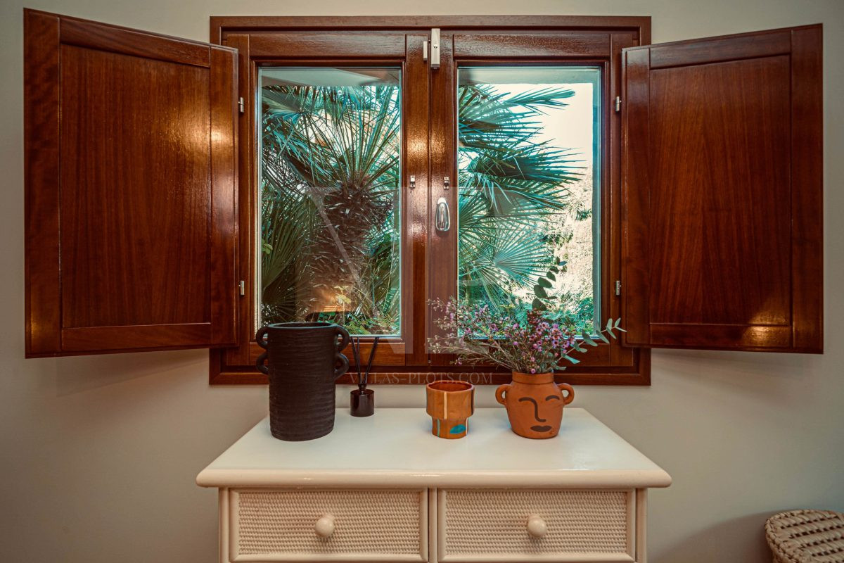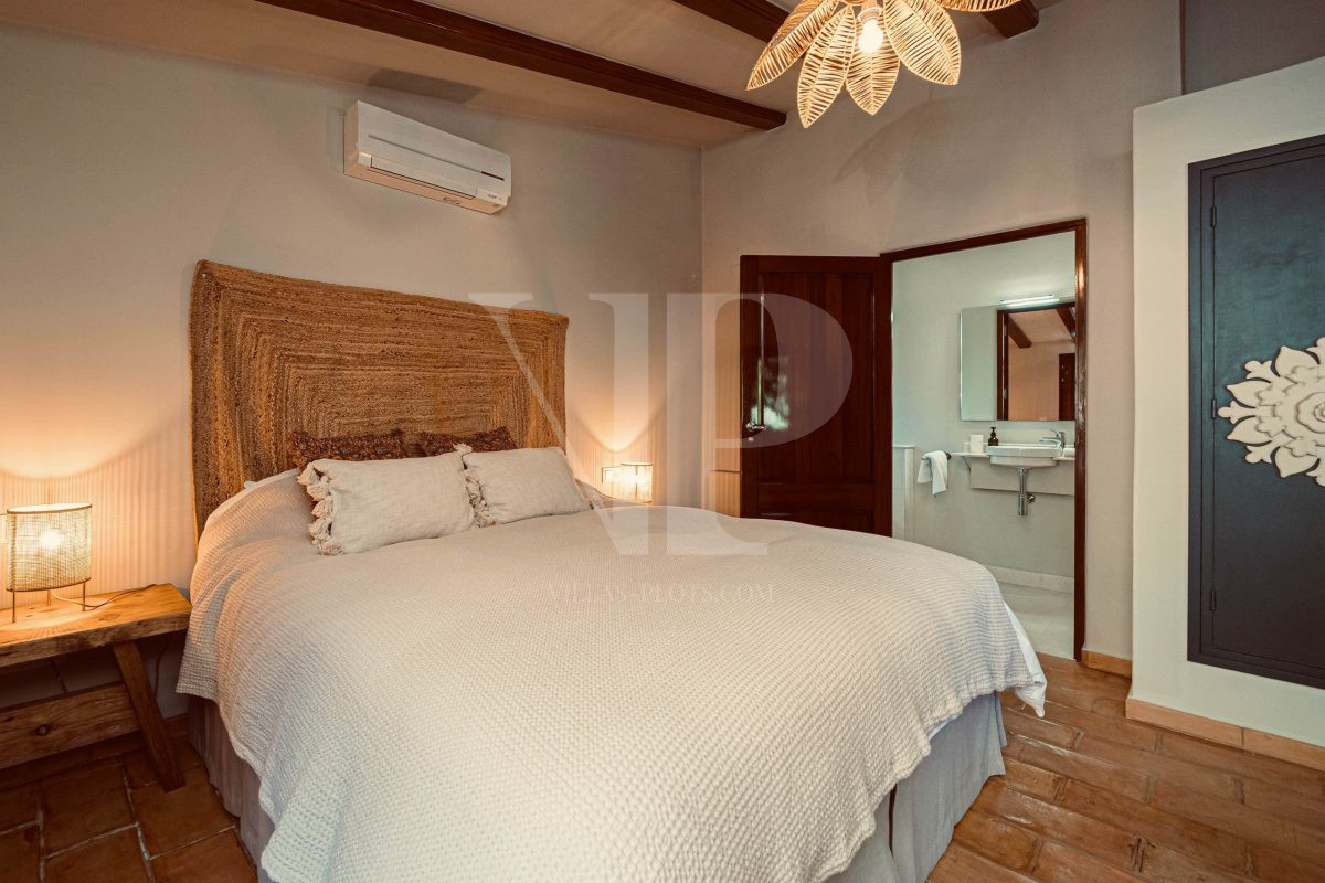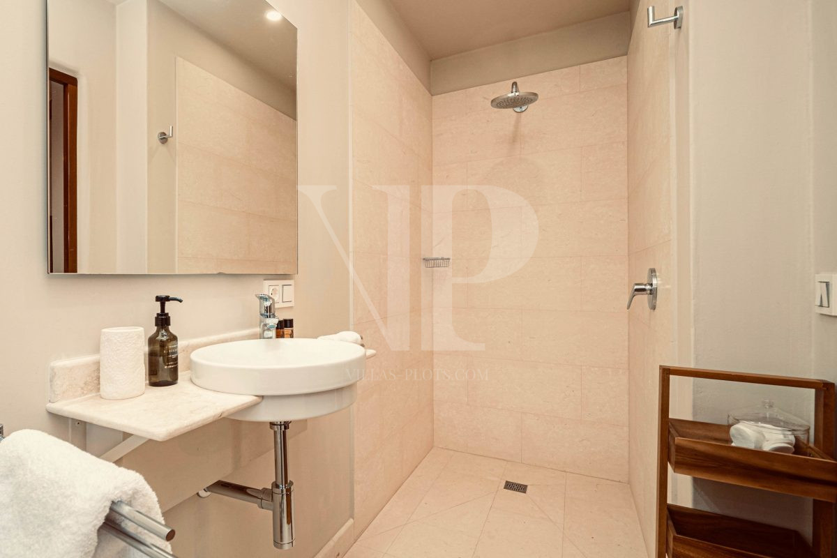 Through a spacious entrance hall you enter a bright living and dining area with an adjacent open-plan fully equipped kitchen. This level also features a bedroom with en-suite bathroom, a guest toilet and a separate laundry room. In addition, there is an extra bedroom with private access and its own bathroom, ideal for guests. From the living area there is a direct access to a charming interior patio and a large traditional naya with a lounge and an outdoor kitchen.